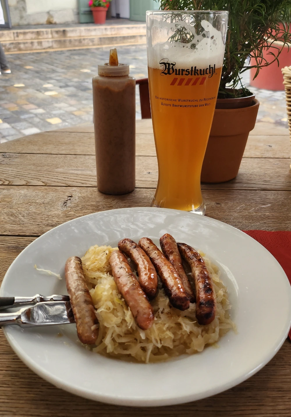 다시 Steinerne Brücke로 돌아와 드디어 Historische Wurstkuchl에 갔다. 다행히 딱 한 자리가 남았었다. 밀맥주 한 잔과 Bratwurst 6개를 주문했다—가격표를 보고 흠칫 놀랐다. 밀맥주가 먼저 나와 한 모금 마셔보았는데, 매우 실망스러웠다. 밀맥주 흉내를 내다 실패한 것인지 물을 탄 것인지 너무 밍밍했다. 밀의 부드러움이 거의 느껴지지 않았고, 그렇다고 보리의 향도 세지 않았다. 곧바로 소세지도 나왔다. 대단한 소세지를 기대했지만, 천 년이라는 세월 동안 폭삭 늙은 것인지, 비실비실한 Bratwurst 6개가 수북한 Sauerkraut 위에 올려져 있었다. 맛이야 당연히 있었다. 다만 14.4유로나 되는 돈을 주고 먹기에는 많이 아쉬웠다. 차라리 수퍼마켓에서 Bockwurst를 하나 사다 오븐에 구워 먹는 게 훨씬 더 맛있는데. 너무 시어서 소세지 없이 먹기 힘든 Sauerkraut만 남긴 채, 직원에게 "Stimmt so."라 말하며 20유로를 건네고 나왔다.