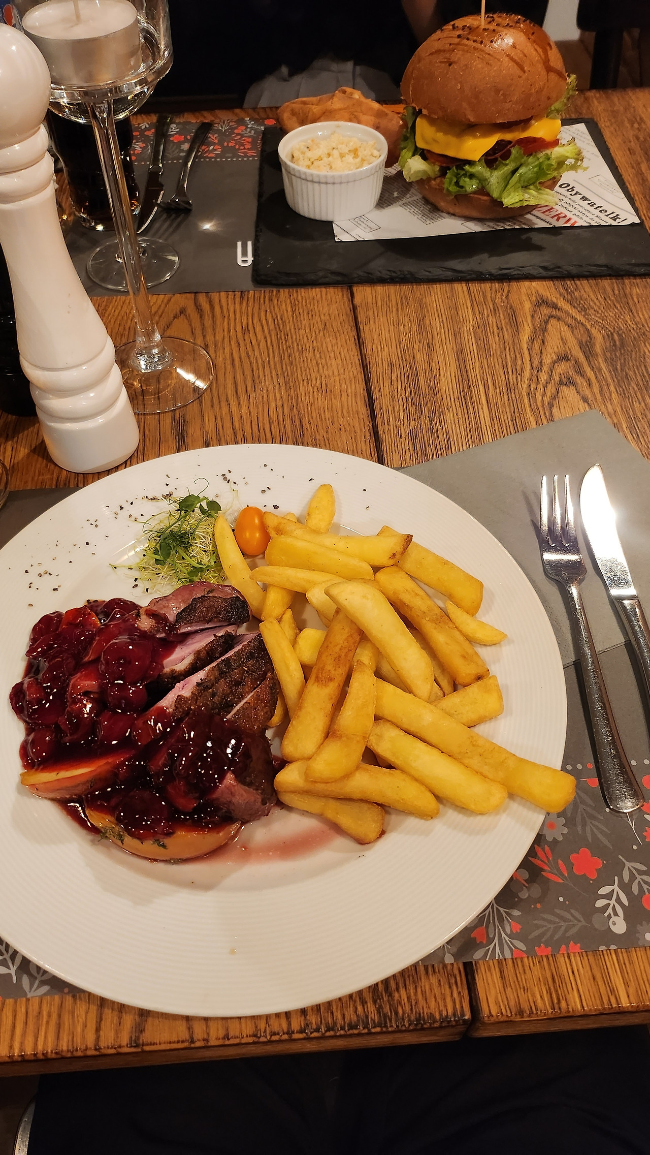 밖으로 나오니 다시 동화 같은 마을이 보였다. 칙칙한 회색 암석만 보다가 푸른 들판과 빨간 지붕을 보니 마음이 편안해졌다. Graduation Tower에 들러서 마을 전경을 내려다보고 점심을 먹으러 갔다. 구글맵 평점이 무려 4.8이나 되면서 가격대도 괜찮아 보이는 Sztolnia Wieliczka라는 식당을 찾아 망설임 없이 거기로 갔다. 나는 사과와 체리 소스로 덮인 오리 가슴살, 동행은 수제 버거를 주문했다. 이번 유럽 여행에서 고른 식당 중 단연 최고였다. 지금 글을 쓰는 이 시점에서도 다섯 손가락에 꼽을 정도로 매우 만족스러웠다. 오리고기 자체도 맛있었는데, 처음 시도해 보는 사과 체리 소스랑도 매우 잘 어울렸다. 게다가 이 지역 양조장에서 만든 맥주 500mL도 시켜 마셨는데, 엄청 대단하지는 않았지만 라거답게 정말 깔끔해서 좋았다. 그리고 오리고기와 맥주 1잔에 50즈워티도 안 되어서 이 식당을 나갈 때도 만족스러웠다. 딱 아쉬웠던 점 한 가지는 내 뮌헨행 비행기가 이륙하기까지 2시간 정도밖에 안 남았어서 여유롭게 대화하며 먹지 못하고 일찍 나와야 했던 점이다.