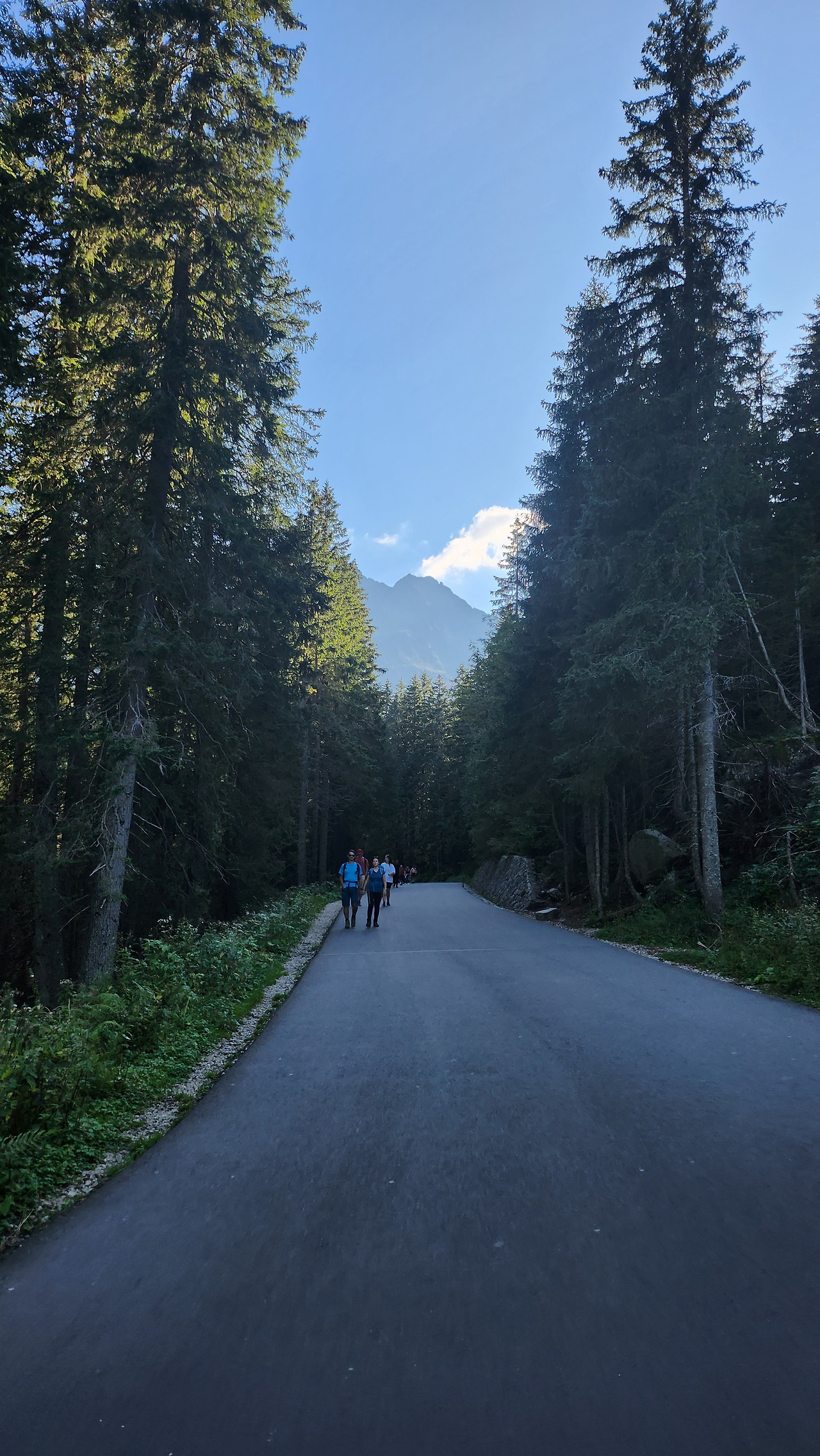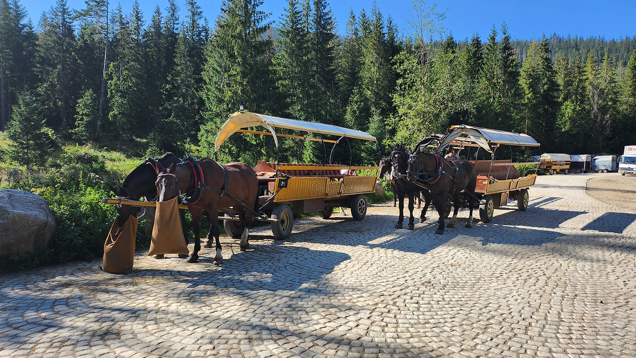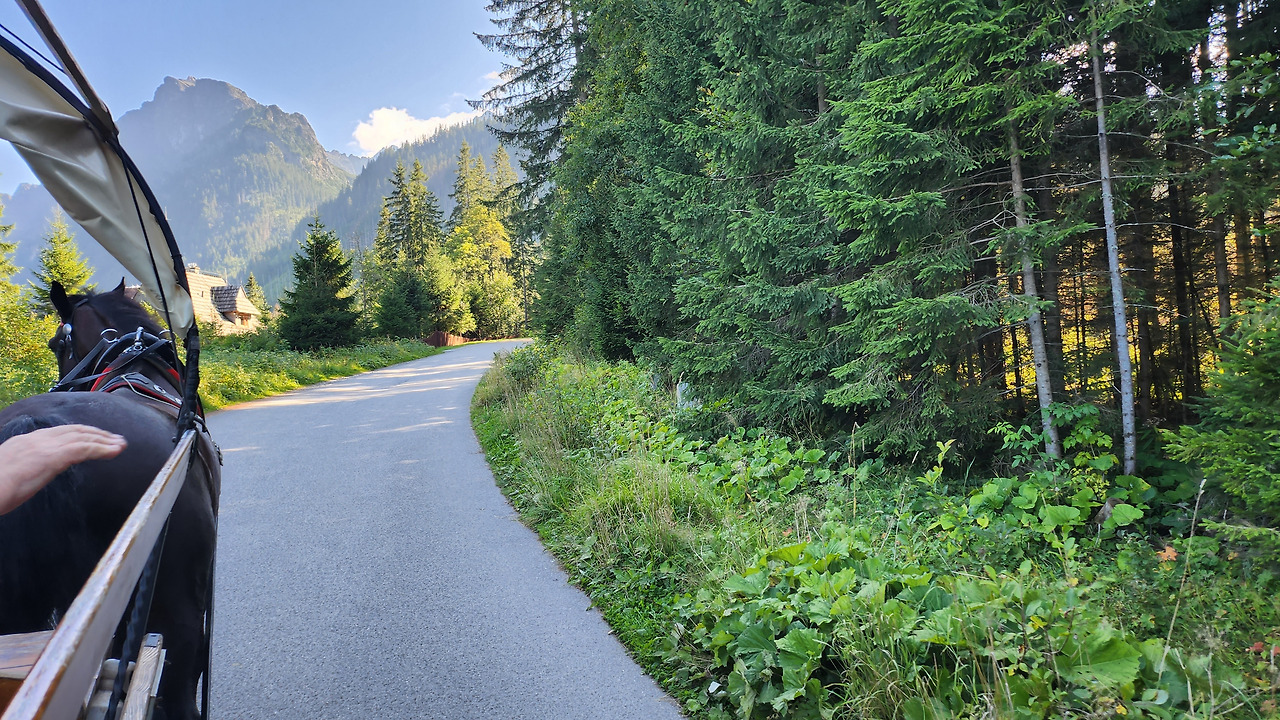 자코파네 시내에서 타트라 국립공원까지 가는 데에는 또 버스를 30분 정도 타야 했다. 이 버스를 타는 곳을 찾는 데에 꽤나 애를 먹었다. 버스 터미널처럼 생긴 곳이 2곳 있었고, 도로 중간중간에도 버스들에 있어서 이리저리 돌아다닌 끝에 겨우 찾을 수 있었다. 그렇게 15시가 다 되어서야 공원에 도착했다. 올라갈 때는 걸어서 올라가고 싶었으나, 그러기에는 시간이 너무 늦어 마차―올라갈 때는 무려 90즈워티나 내야 했다―를 타고 다녀오기로 했다. 2마리의 튼실한 흑마가 등을 마주대고 앉는 형식의 긴 마차를 끌고 있었다. 개인적으로 이 방식의 마차가 매우 마음에 안 들었다. 마차가 가는 방향을 보고 앉으면 좌우로 경치를 볼 수 있지만, 옆을 보고 앉으면 반대편의 경치를 못 보기 때문이다. 실제로 우리는 오른쪽을 보고 앉았는데, 도로가 산을 시계방향으로 타고 올라가는 구조라 반대편의 탁 트인 경치는 뒤를 완전히 돌아야지 볼 수 있었다.