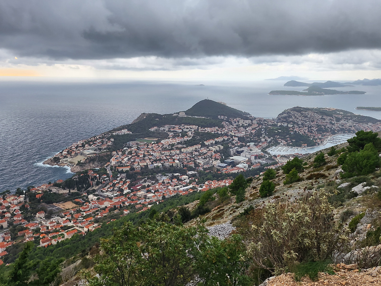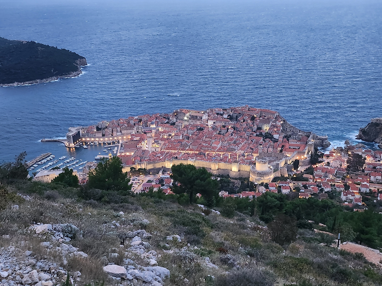 일몰이 막 시작되었을 즈음 전망대에 도착했다. 큰 십자가가 있고 계단과 난간을 잘 만들어놓은 그럴싸한 전망대도 있지만, 두브로브니크 성벽으로 둘러싸인 구시가지를 제대로 볼 수 있는 곳은 따로 있었다. 제대로 닦인 길이 없고 울퉁불퉁한 바위들이 널브러진 경사진 돌바닥이 명당이었다. 이 황량한 전망대에서 30분 정도 그나마 평평한 바위 위에 앉아 구시가지를 멍하니 바라보았다. 산꼭대기라 바람도 거세게 불고 바닥은 딱딱하고 사람은 아무도 없었다. 광활한 바다에 맞서 굳건히 버티고 있는 성벽이 산꼭대기의 거센 바람을 맞으며 버티고 있는 지금 내 처지가 비슷하다는 생각이 들었다. 하산 막바지에는 해가 완전히 져버려, 휴대전화 손전등을 켜지 않으면 앞이 보이지 않았다. 발목이 돌아가지 않게끔 한걸음 한걸음 긴장하게 발을 디뎠다. 무사히 하산한 뒤 시내로 내려와서는 환하게 불이 켜진 성벽을 잠깐 둘러보다 햄버거와 맥주를 사들고 숙소로 돌아왔다.