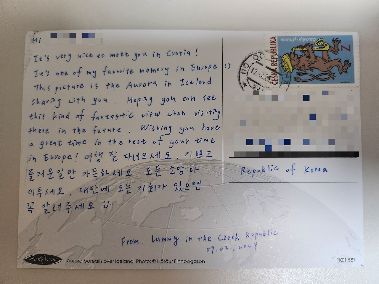 후의 일이지만, 2월에 그녀는 갑자기 내 한국 주소를 물어보더니 체코에서 엽서를 써서 내게 보내주었다. 마침 나도 딱 귀국한 직후라 바로 받아 읽을 수 있었다. 겨우 두 번 얼굴을 본 사이인데 타국에서 손편지까지 보내주어 감동받았다. 안 그래도 귀국 후 바로 5일 뒤 매우 중요한 시험이 있어 스트레스가 심했는데, 이 편지 덕분에 힘이 났다. 여덟 달이 지난 지금도 여전히 2~3일에 한 번씩 Whatsapp을 주고받는다. 대만에 가게 되면 꼭 그녀를 찾아가야겠다.