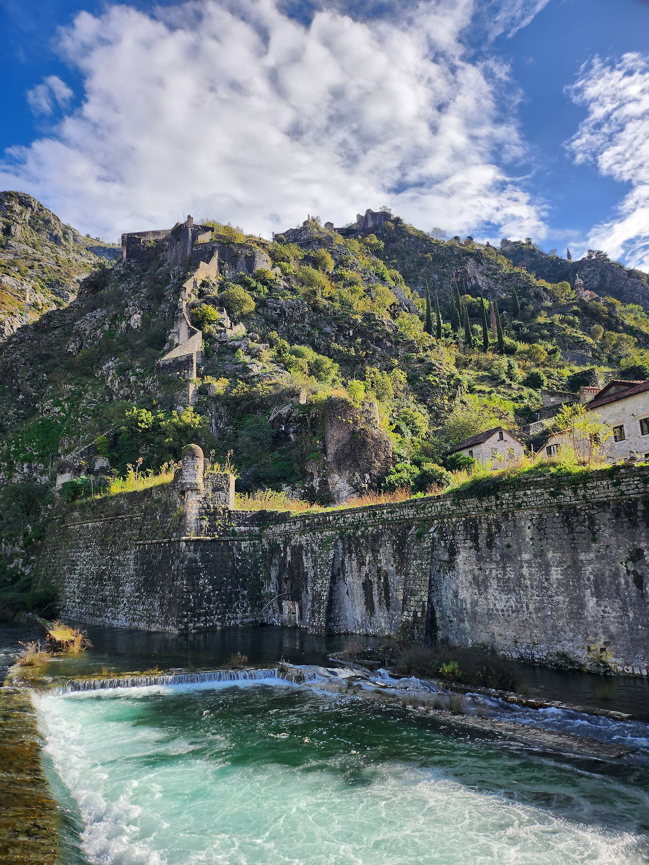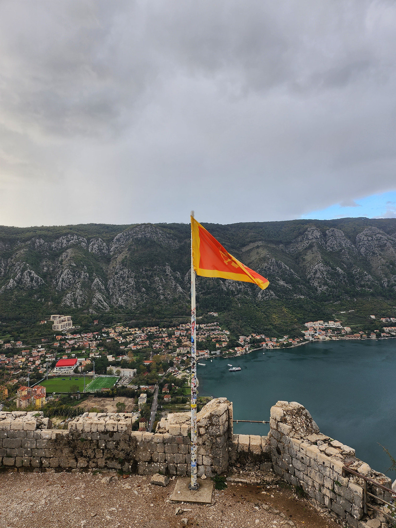산을 타고 넘어가는 코토르 요새 | 이때부터 먹구름이 조금씩 들어섰다 | 처량히 남겨진 몬테네그로 국기