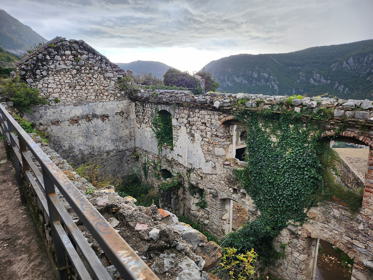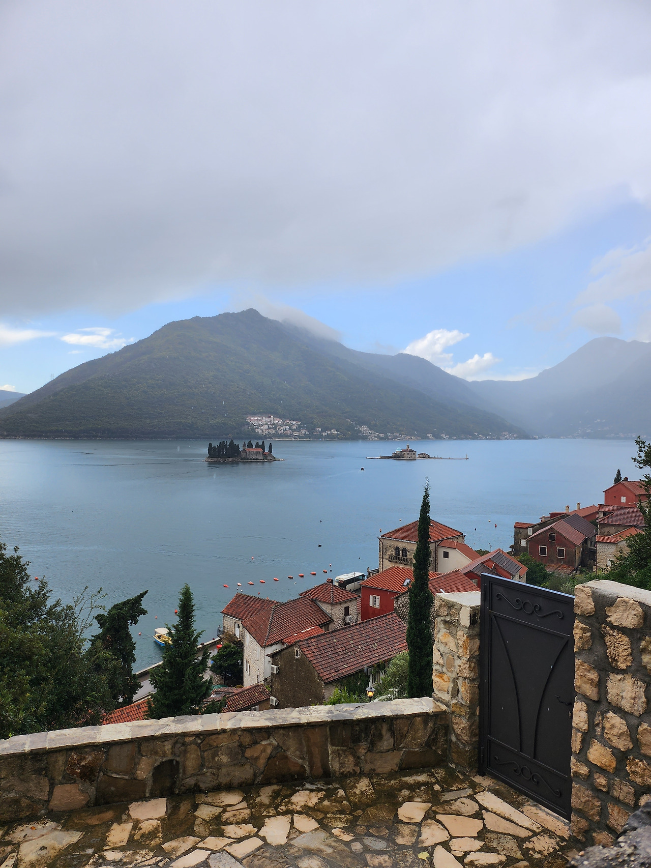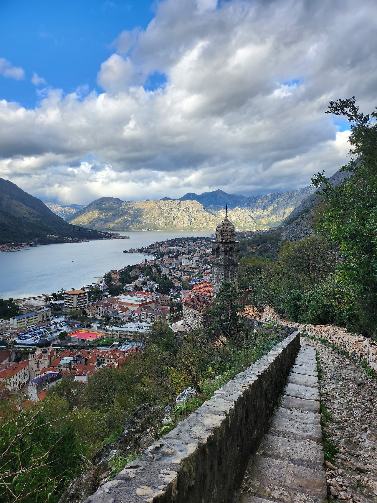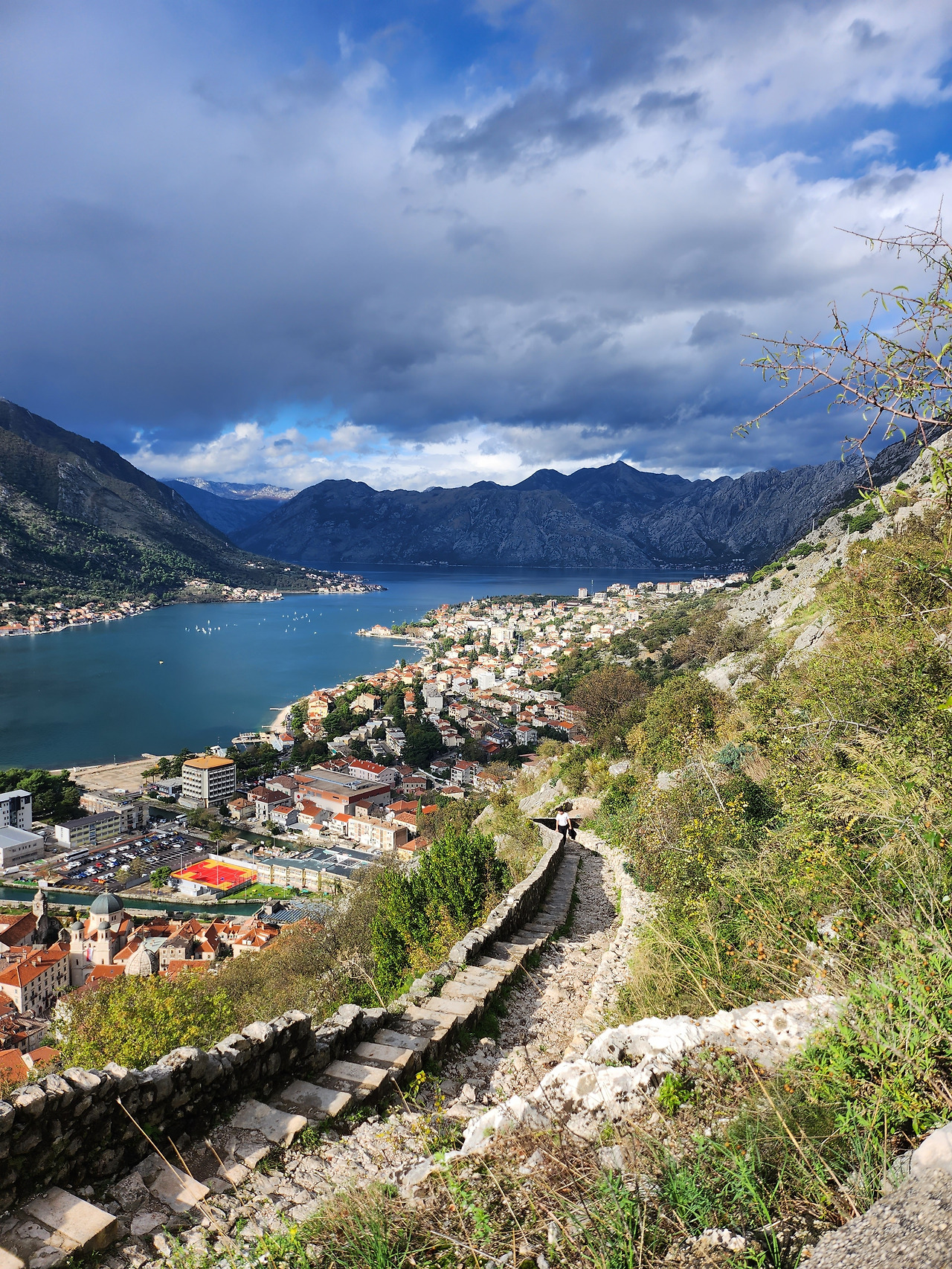성벽 내부 마을을 쓱 둘러보고 코토르 요새로 올라갔다. 15유로의 거금을 내고 등산로로 입장했다—중량 조끼를 입고 뛰면서 올라가는 아저씨는 현지인이라 무료로 들어갔다. 이곳도 스르지산처럼 1시간 가까이 올라가야 한다는 사실은 이미 알았지만, 이 정도는 내게 가뿐하다고 생각되어 호기롭게 올라갔다. 하지만 돌계단 하나하나 디딜 때마다 체력이 급격하게 떨여졌다. 그동안 쌓인 여독 때문도 있지만, 날씨가 정말로 괴랄했다. 전날 날씨는 양반이었다. 분명 정오까지 쨍쨍하던 해를, 북쪽 한 켠에 몰려있던 먹구름이 뒤덮으며 비를 쏟아내기 시작했다. 땀이 너무 나 내복처럼 입던 흰 반팔만 입고 있었는데, 그 위에 바람막이를 입는 기괴한 패션을 선보일 수밖에 없었다. 중간중간 성모교회와 주거지 등을 지나 요새에 도착했다. 이 성벽을 직접 오르고 보니, 내가 적군이었으면 싸워볼 생각조차 안 하고 깔끔히 회군했을 것이다. 숨도 고를 겸 코토르 시내를 바라보다 비가 갠 뒤 내려왔다.