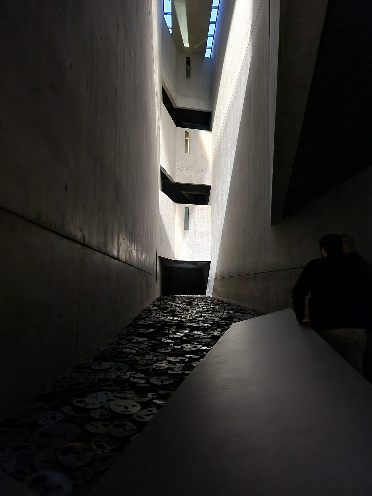 바닥에 얼굴 형태의 디스크가 깔려있는 유대인 박물관의 한 전시관 | 형제의 키스