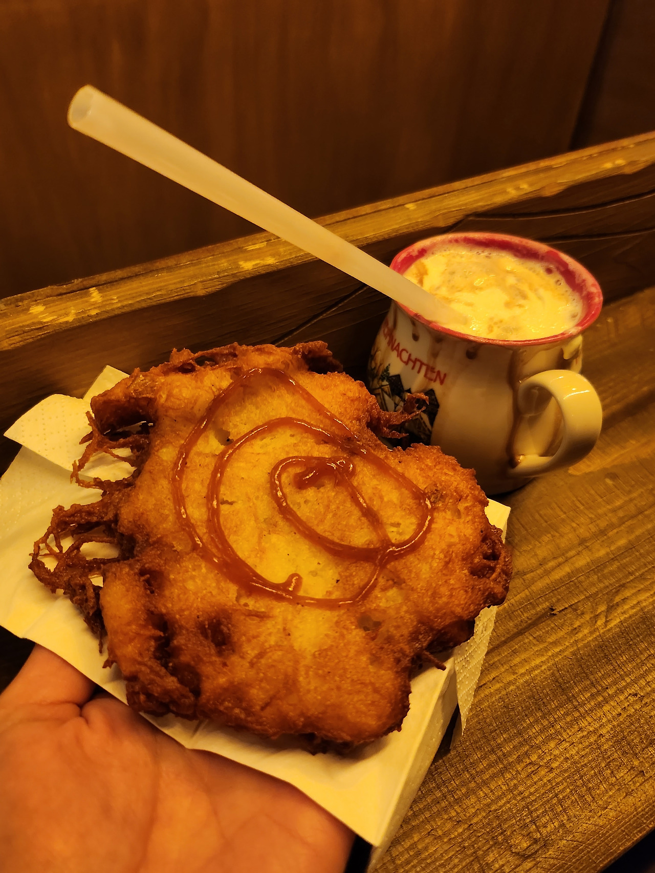 친구들이 크리스마스 마켓에서 먹어보고 싶어 한 음식이 몇 가지 있었다; 으깬 감자를 튀긴 Kartoffelpuffer, 우유와 달걀로 만든 따뜻한 칵테일인 Eierpunsch 등. 저녁을 이곳에서 해결할 계획이라 여유만 있었다면 이것저것 다 사 먹을 수도 있었으나, 사람이 너무 많아 그러진 못했다. 그래도 각자 Glühwein이나 Eierpunsch 한 잔씩 들고 Kartoffelpuffer와 크레페, Bratwurst를 사 왔다. 겨우 좁은 테이블을 하나 발견해 옹기종기 모여서 나눠 먹었다. 크레페는 내가 좋아하지 않는 빵 종류고, Bratwurst야 이미 많이 먹어봤기 때문에, Kartoffelpuffer가 참 궁금했었다. 특이하게 위에 사과소스(Apfelmus)를 뿌려져 있어 맛에 의구심이 생겼으나, 의외로 바삭한 튀김과 따뜻한 감자랑 잘 어울렸다. 감자에 카레맛이 살짝 나는 듯한 것은 좋았지만, 너무 짠 것은 조금 아쉬웠다.