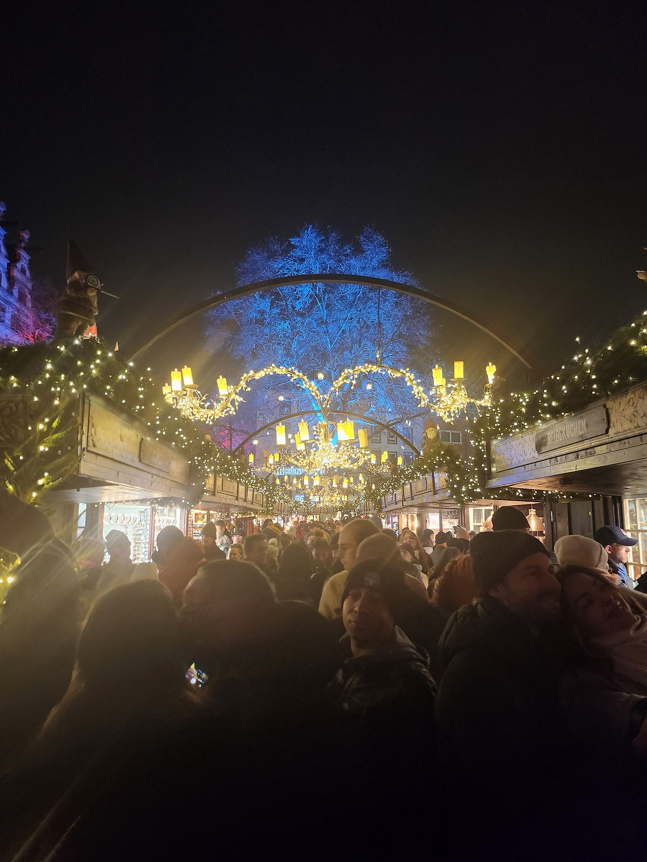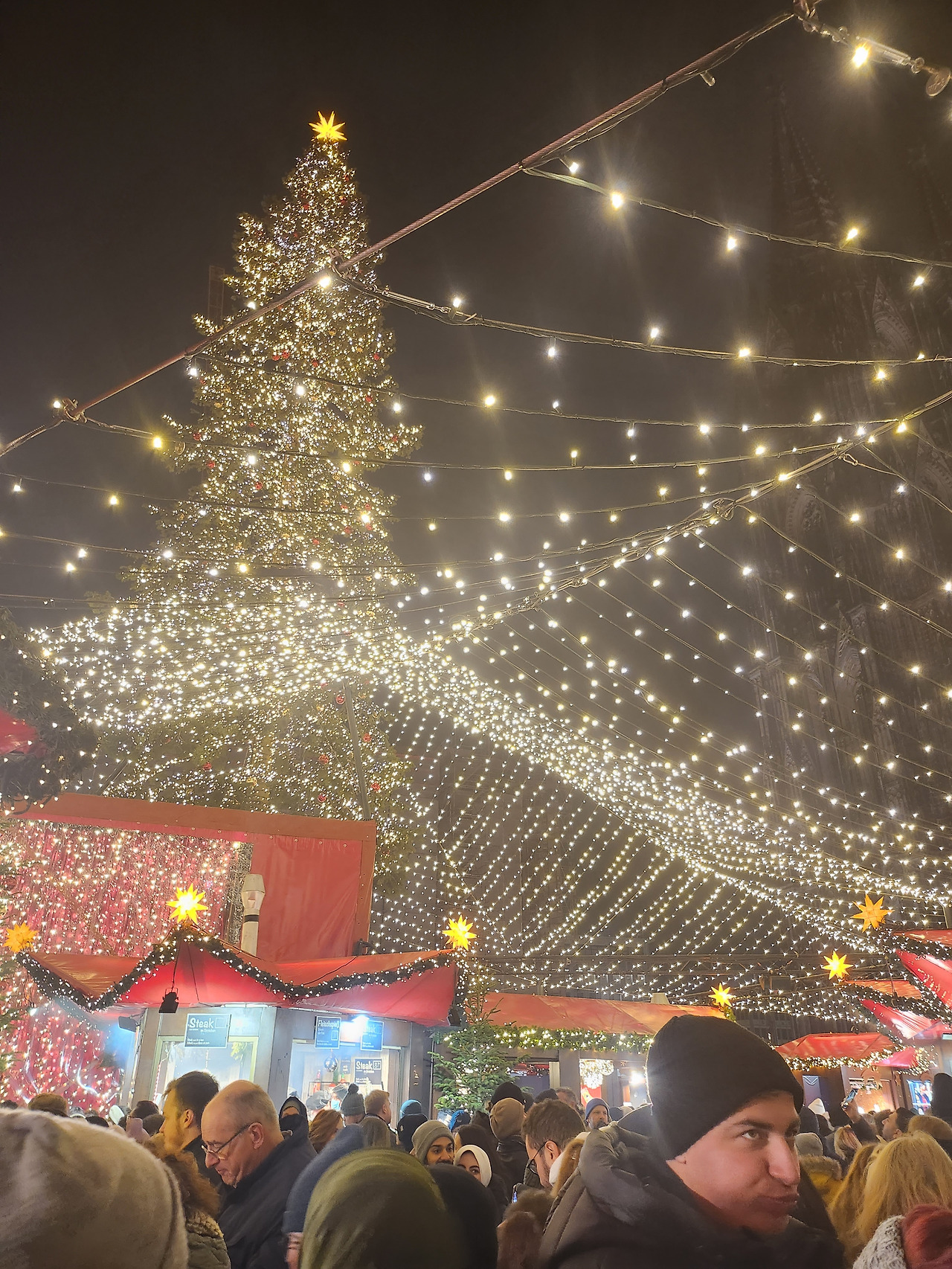 크리스마스 마켓이 한 광장에서만 열리는 것이 아니기 때문에 힘겹게 이곳을 빠져나와 쾰른 대성당 근처 광장으로 가보았다. 아직 배가 다 차지 않아 간단하게 츄러스와 함께 음료를 한 잔씩 더 사 마셨다. 이번에 나는 기존 Glühwein에 아마레토를 한 샷 추가하여 마셔보았는데, 비싸지만 드디어 술을 마신다는 느낌이 나서 좋았다. 대성당 쪽 광장은 특이하게 크리스마스트리를 중심으로 조명을 거미줄처럼 엮어 머리 위에 달아놓았다. 여기에 점포 천막은 빨간색으로 되어 있어 크리스마스 분위기가 흠씬 풍겼다. 그리고 한편에는 밤하늘에 모습을 감춘 듯한 쾰른 대성당이 자리를 지키고 있었다. 이후에도 여러 크리스마스 마켓을 가봤지만, 이곳만큼 예술적인 곳은 없었다.