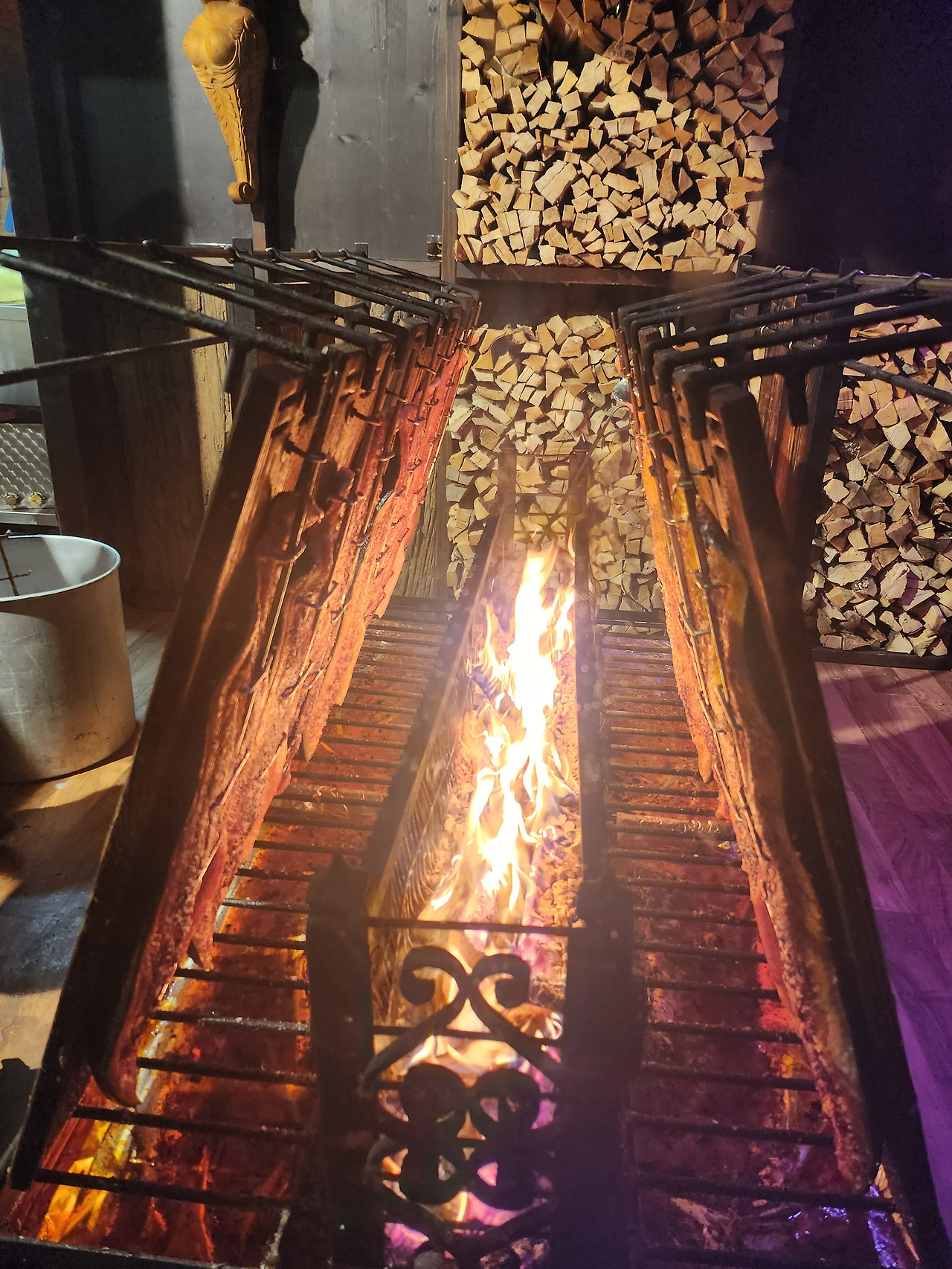 화로에서 맛있게 구워지고 있는 연어들 | 한걸음 한걸음 내딛기 힘들 정도로 사람들이 붐볐다 | 반짝반짝 빛나는 천장 조명