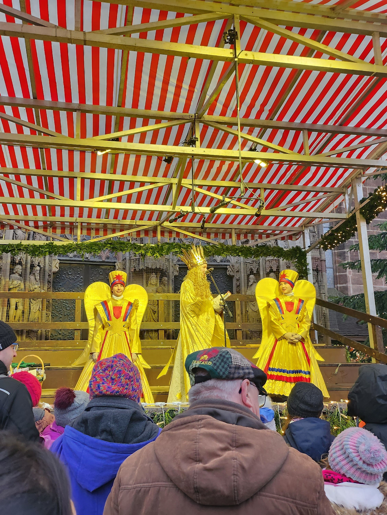 다시 내려와 성 게발트 교회에서 모였다. 여기서 또 다른 동행 JY 누나도 합류했다. 인사를 나누고 근처에 있는 Hauptmarkt 크리스마스 마켓을 구경했다. 내려오는 길에서부터 아직 불이 켜지지 않은 날개 달린 천사 모양의 전등들이 있었다. 그리고 마켓에 들어가니 천사 인형도 있었고 심지어 금빛 천사 분장을 한 사람들이 공연을 하고 있었다. 인터넷에 찾아보니 이 천사가 뉘른베르크의 상징이라는데, 정작 왜 상징이 되었는지 정확히 아는 사람은 아무도 없다고 한다. 여러 설이 있지만 어찌하였든 이 금빛 천사의 존재 덕분에 다른 크리스마스 마켓들과 차별화된 모습을 보여줄 수 있게 되었다는 생각이 들었다.