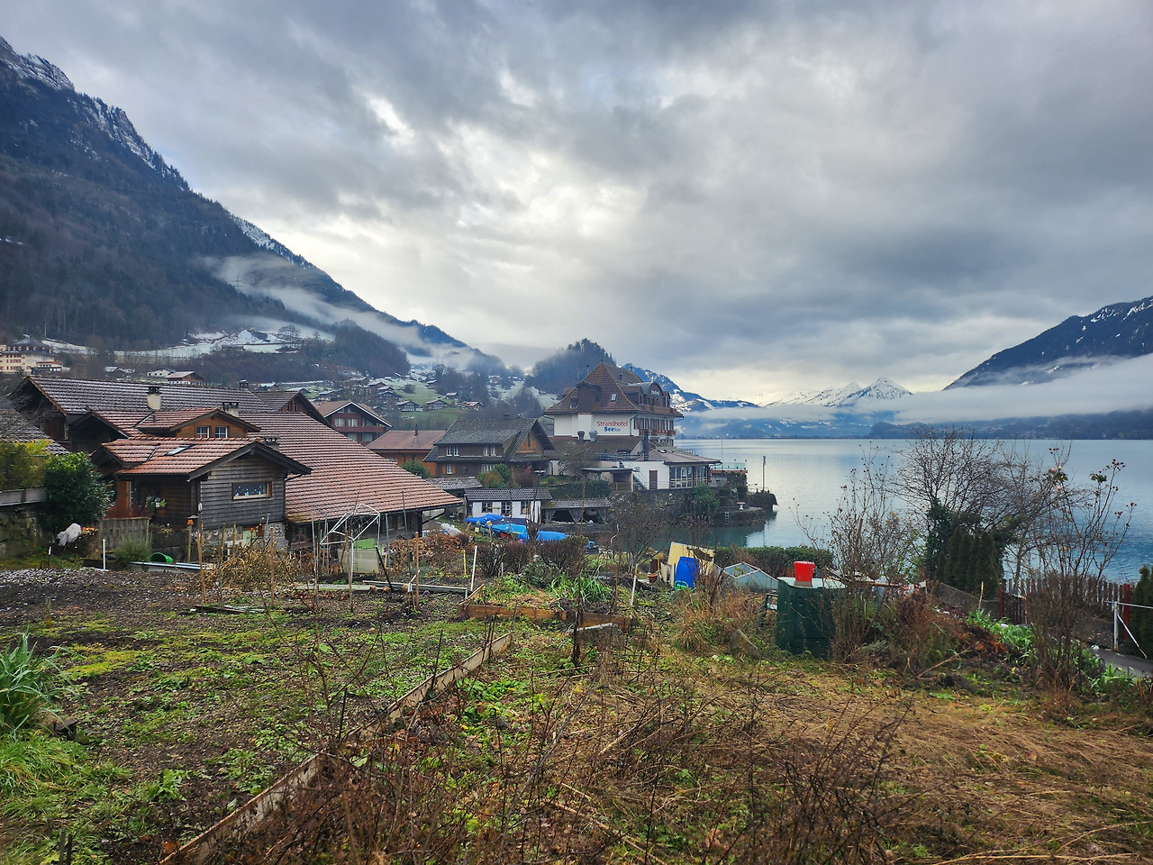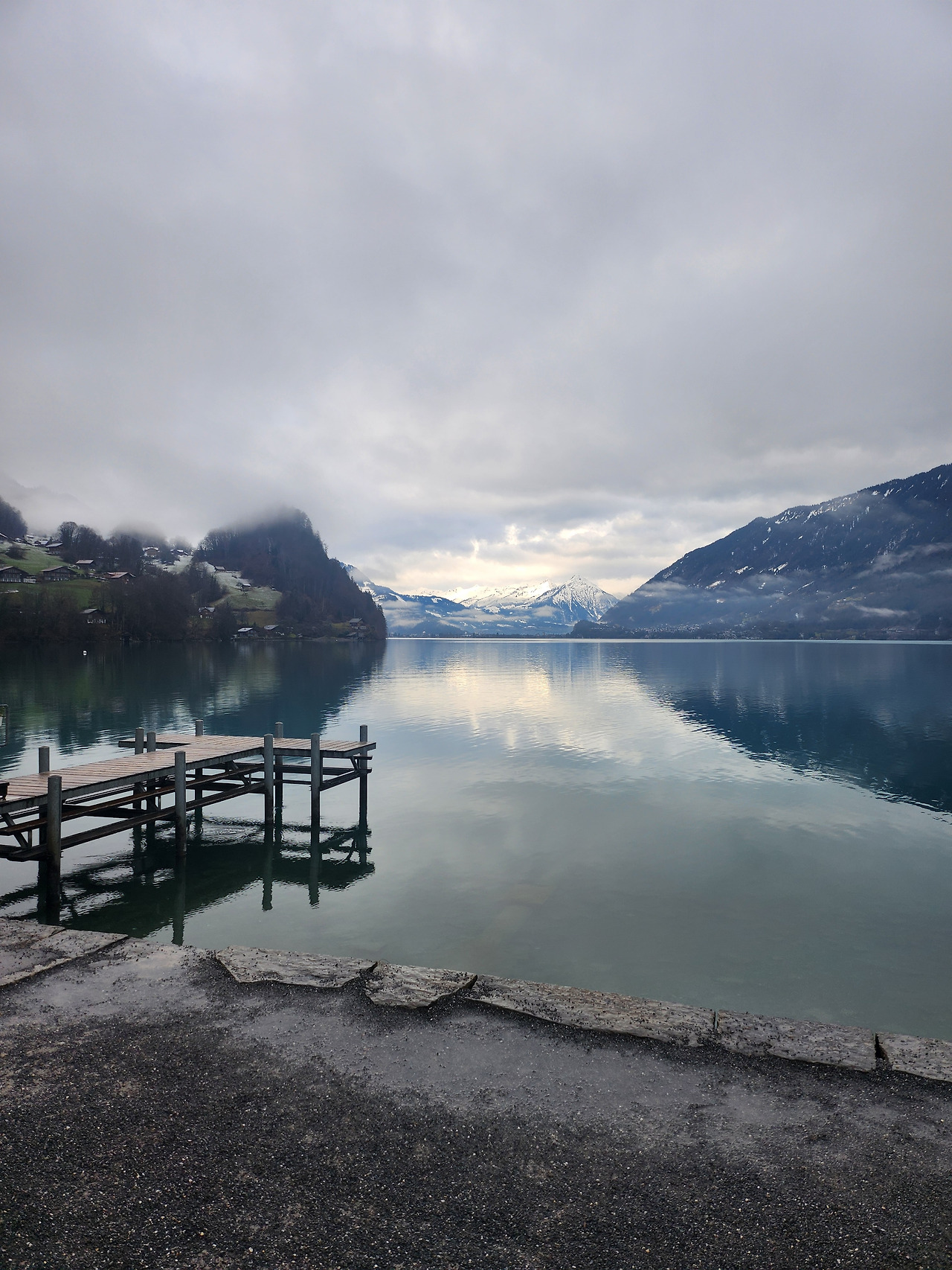 여유롭게 일어나 빵과 시리얼로 느긋하게 아침을 맞이했다. 전날과 다르게 구름이 가득했고, 길가는 살짝 촉촉했다. 일기예보를 통해 정오쯤 되면 날이 맑아질 거라는 것을 확인하고 우선 이젠트발트라는 곳에 가기로 했다. 브리엔츠 호수 남쪽에 있는 작은 마을인데, '사랑의 불시착' 촬영지로 매우 유명하다. 어머니 어깨너머로 스쳐본 것이 전부였지만, 괜히 이곳을 촬영지로 선정하진 않았을 거라 믿고 한국인들을 따라 버스를 타고 갔다. 아니나 다를까, 마을에서 바라본 호수는 너무나 아름다웠다. 날씨가 흐린 것이 조금 아쉬웠지만 그래도 알프스와 맑은 호수는 여전히 환상의 궁합을 보여주고 있었다. 그리고 T자 모양의 목재 부두가 밋밋함을 덜어주고 감성을 더해주었다. 이곳에는 한국인들만 있었는데, 이미 사진 구도를 다 파악해 온 듯했다. 그들이 찍는 것을 구경한 뒤, 그대로 사진을 찍어달라 부탁했다.