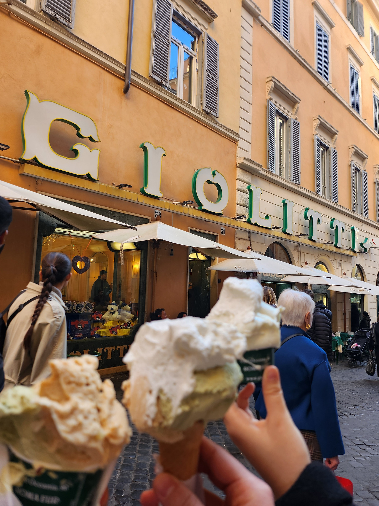 수많은 사람들에 치어 피곤해진 우리는 포로 로마노는 건너뛰고 일단 판테온 근처로 가서 점심을 먹었다. 좁은 골목에 있는 Achille Al Pantheon di Habana라는 식당에서 까르보나라와 소꼬리찜 파스타를 먹었다. 가이드가 추천해 준 식당이라 그런지 한국인 단체 관광객들이 많았다. 계란으로만 만든 순정 까르보나라가 내게는 신기했는데, 크림과는 또 다른 꾸덕한 것이 내 입맛에 맞지는 않았다. 식사를 다 마치고 판테온에 들어갔다. 5유로나 내고 들어갔으나 볼 게 많지 않아 돈이 아까웠다. 또 다른 로마 3대 젤라또인 지올리띠 젤라또에 갔다. 올드브릿지와는 정반대로 규모가 크고 내부도 고급스러웠다. 물론 맛은 아는 그 맛이었다. 이때까지 이탈리아에서 젤라또를 3번 먹었는데, 피스타치오 맛은 절대 빼놓지 않았다. 무슨 맛을 고를지 고민될 때 피스타치오만한 든든한 맛이 또 없기 때문이었다.