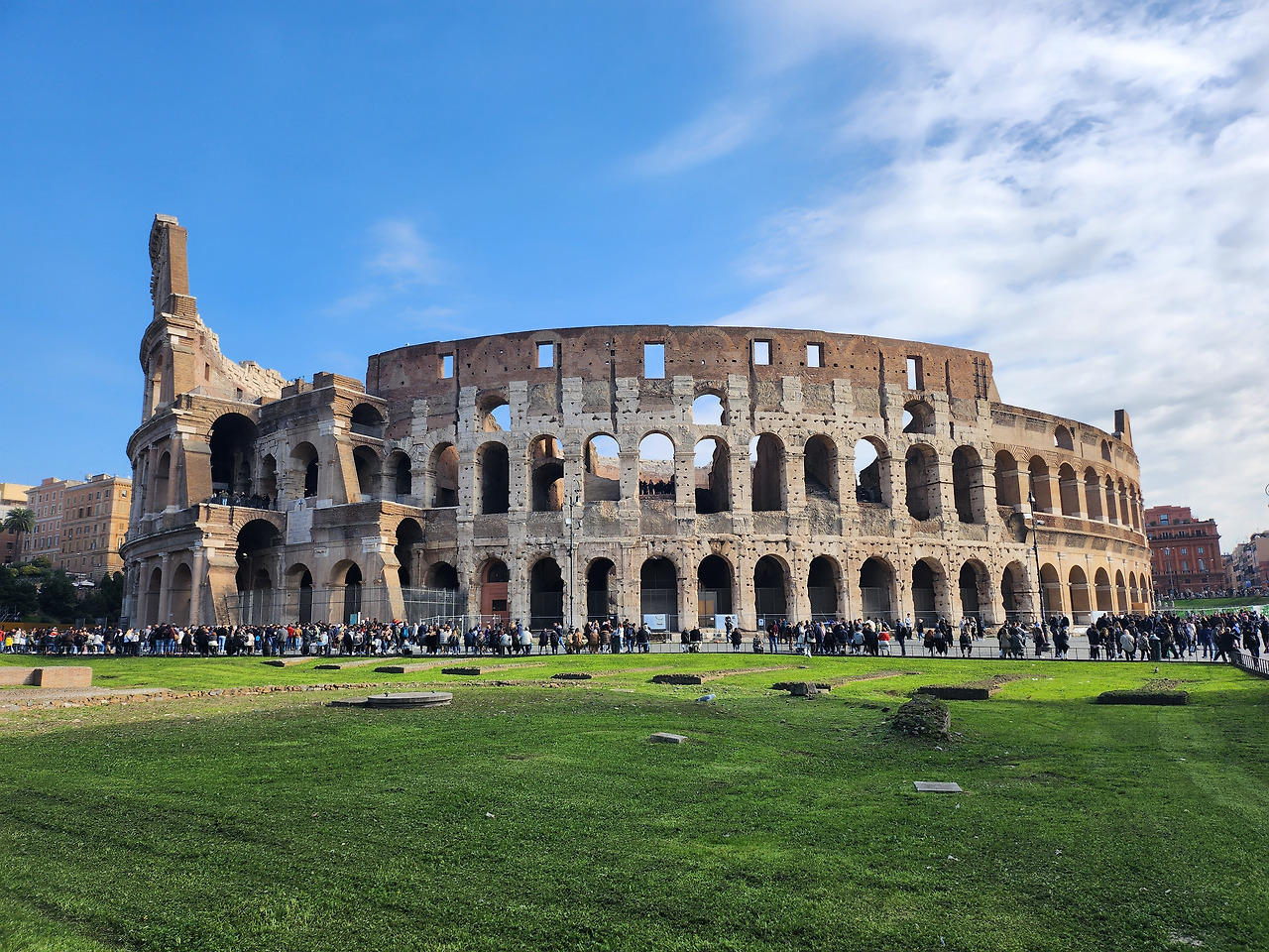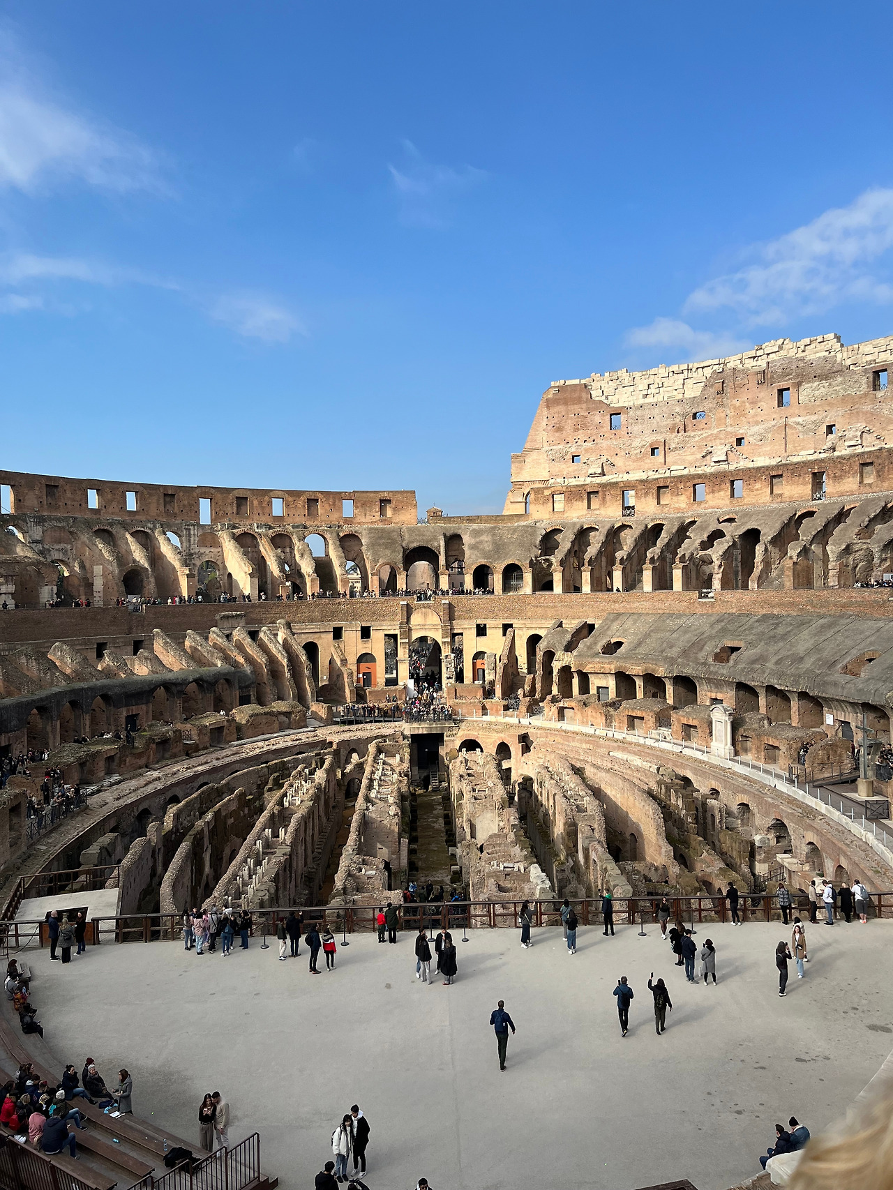 콜로세움은 가장 유명한 유적지인 만큼 매우 붐볐다. 특이했던 점이라면, 바티칸에 비해 중국인의 비율이 눈에 띄게 늘었다는 점이다. 바티칸은 종교 작품이 주인 관광지이기 때문에, 다른 곳에 비해 학구열이 높은 우리나라 사람이 많다고 한다. 콜로세움 내부 역시 사람들로 꽉 찼다. 그 때문에 사진이 잘 찍히는 난간을 차지하기란 무척 어려웠다. 웅장한 외부와는 다르게 내부는 밑천이 드러난 모습이었다. 관중석은 거의 다 없어졌고, 바닥도 다 드러나 위에서 지하 2층까지 바닥을 볼 수 있었다. 다행히 하늘은 무척 맑았다. 덕분에 적갈색 건축물들이 두드러져, 콜로세움 전체가 보이도록 찍은 사진이 아주 잘 나왔다.