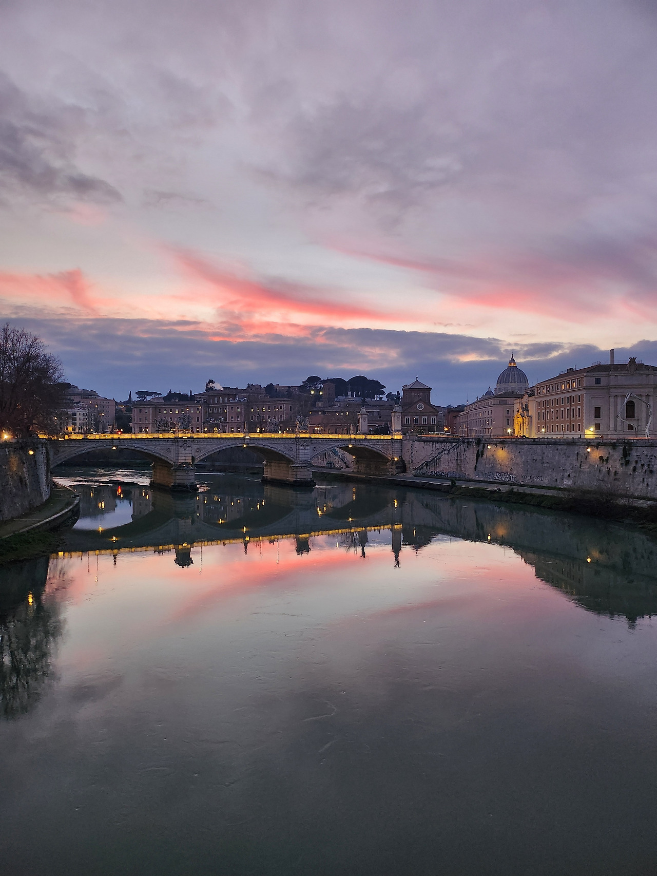젤라또를 야금야금 녹여 먹으며 숙소로 천천히 돌아왔다. 사실 성천사성을 보는 것도 계획해 두었으나, 어머니와 여동생이 무척 피곤해 보여서 취소했다. 아직 시차적응이 되지 않아서 그런 듯했다. 대신 성 천사의 다리까지만 가서 분홍빛 하늘과 하나둘 켜지는 조명을 감상하는 것으로 만족했다. 배고팠던 나만 저녁으로 과자와 맥주를 먹은 뒤, 일찍 일어날 다음날 일정을 소화하기 위해 일찍 자러 들어갔다.