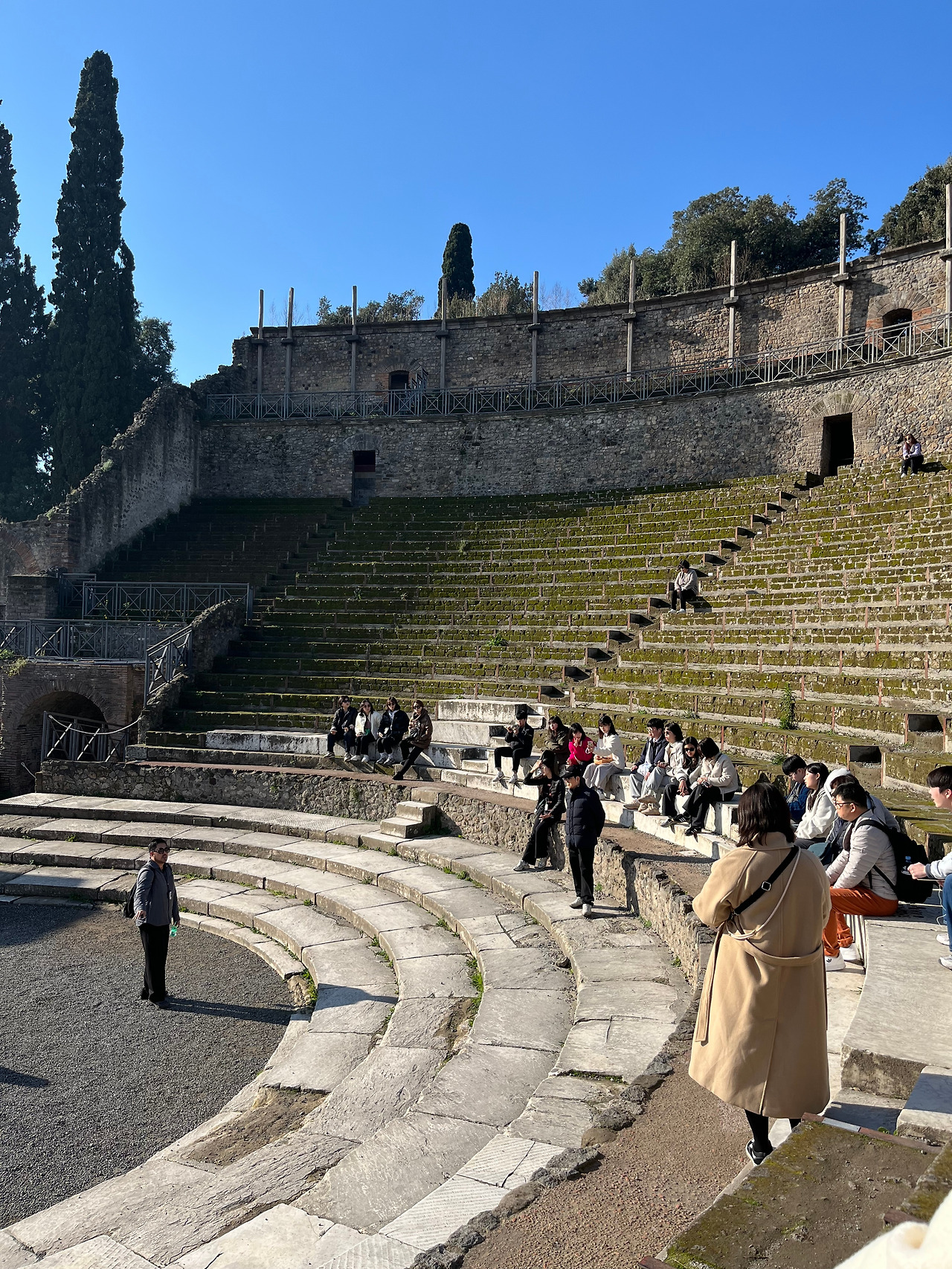 전날 바티칸 투어를 들으러 8시 40분까지 가는 것도 힘들었는데, 이탈리아 남부 투어의 집합 시간은 무려 6시 30분이었다. 그래도 전날 일찍 자둔 덕에 늦지 않게 일어나 딱 맞추어 버스에 올라탔다. 첫 휴게소에 도착할 때까지는 푹 잤다. 이후 폼페이로 가는 길부터 가이드는 쉴 새 없이 떠들었다. 우리는 이번에 박재벌 가이드의 이탈리아 남부투어를 신청했다. 이탈리아 남부 투어 중에서 가장 유명한 동시에 가장 특이하다길래 신청해 보았다. 겉모습은 털이 수북해 거칠어 보였지만, 실은 매우 곰살궂은 따뜻한 사람이었다. 10년이 넘는 경력에서 나오는 연륜이 청산유수처럼 술술 나오는 말에 묻어 나왔다. 더구나 설명이 다른 가이드들에 비해 지루하지 않았다. 폼페이에 도착한 뒤, 먼저 원형극장으로 갔다. 이곳이 소리가 잘 울리도록 설계되었다는 것을 보여주기 위해 가이드는 직접 아리랑도 불렀다. 소리가 울리는 것도 신기했지만, 웬만한 가수 이상의 성량을 보여준 것에 더 크게 놀랐다. 그다음 폼페이 이것 저곳을 돌아다니며 설명을 들었다. 2천여 년 전에는 잘 나갔던 도시인만큼 상상 이상으로 많은 시설들을 갖추었다. 마차의 말을 묶어두는 돌, 하수시설, 공중목욕탕 등 상상 이상으로 많은 시설들이 2천 년 전부터 갖추어져 있었다. 특히 사창가도 번창했었는데, 조각과 그림이 적나라하게 그려져 있는 것이 워낙 인상적이었다.