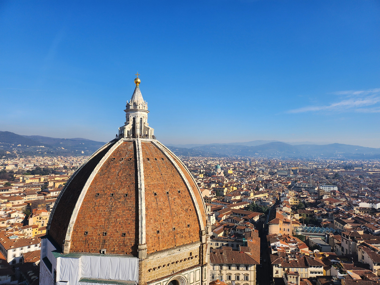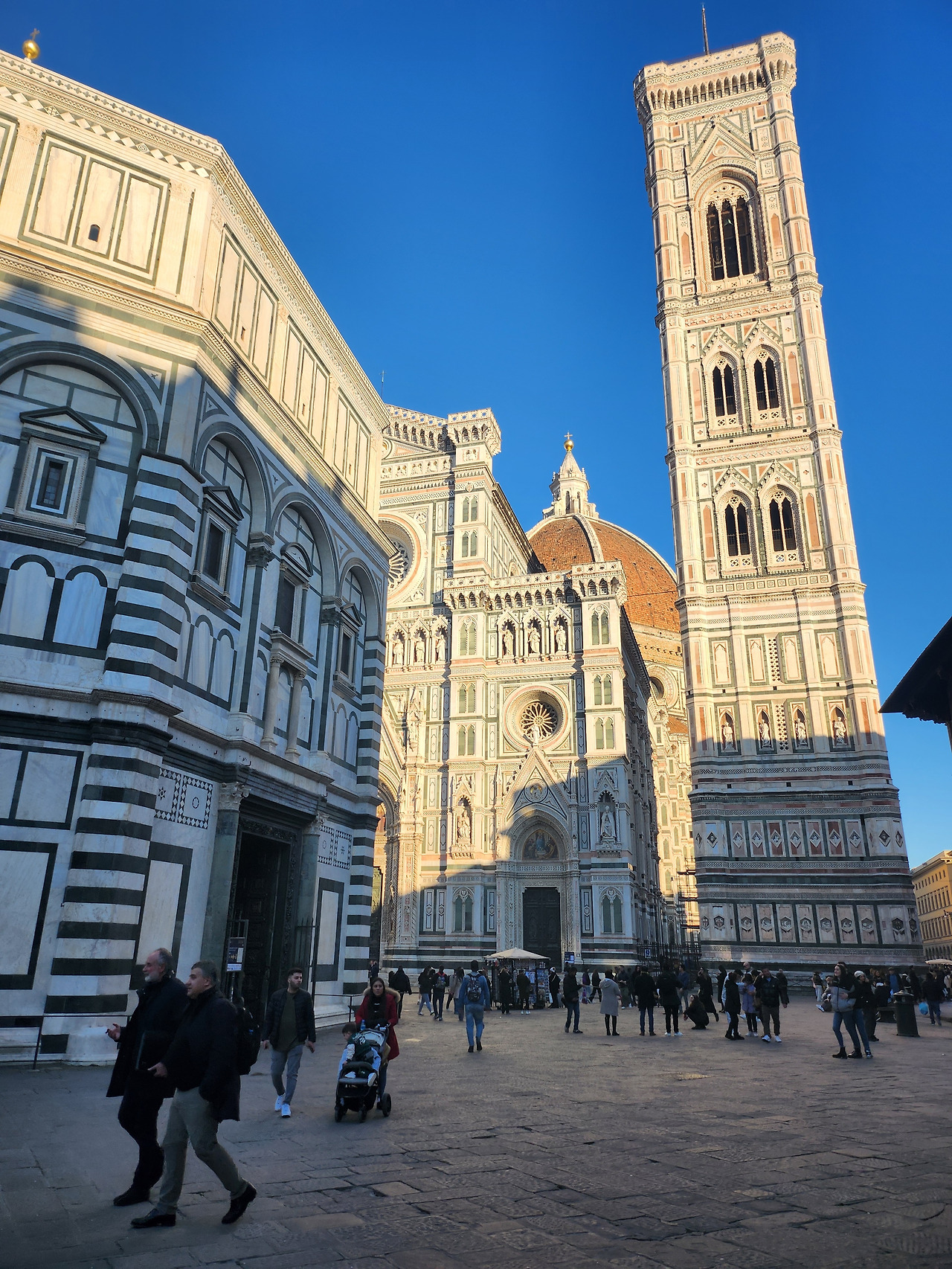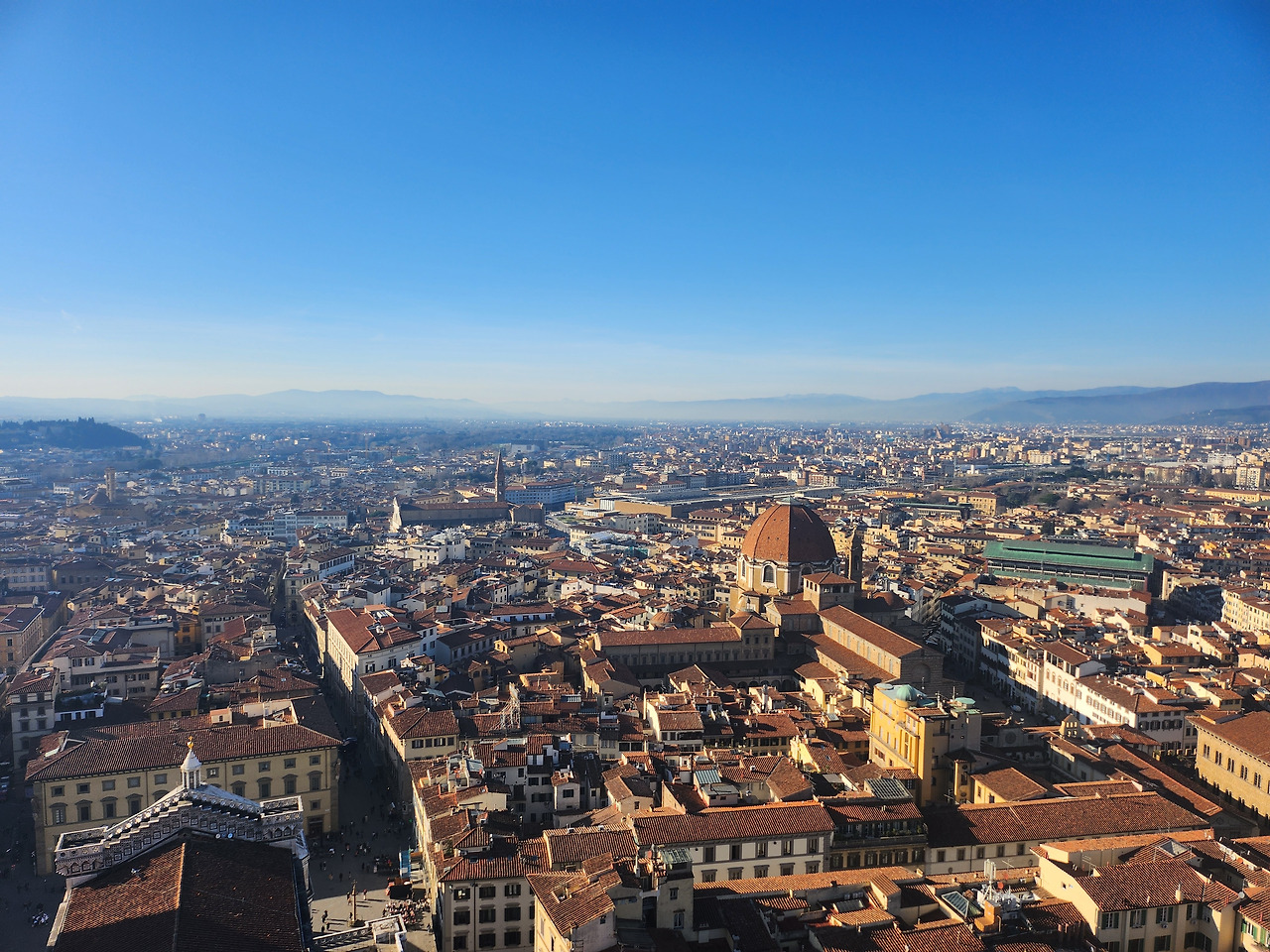 이후 동생 대학교 후배의 인생 맛집이라는 Zaza에 가서 점심을 먹었다. 뇨끼는 조금 아쉬웠지만 카르보나라와 새우 파스타는 기대를 저버리지 않았다. 전날 점심을 먹었던 식당이랑 맛은 비슷한 수준이었는데, 음식값은 경치에 대한 자릿값만큼 더 싸서 이곳 또한 만족스러웠다. 밥을 다 먹고 피렌체 대성당에 다시 가서 내부를 둘러본 뒤 조토의 종탑을 올랐다. 철장이 있는 것은 아쉬웠지만, 그 사이로 보이는 거대한 돔을 찬찬히 뜯어볼 수 있었다. 차분한 피렌체 전경에 떡 하니 서 있는 거대한 돔은 동서남북 위아래 어디서도 돋보였다.
