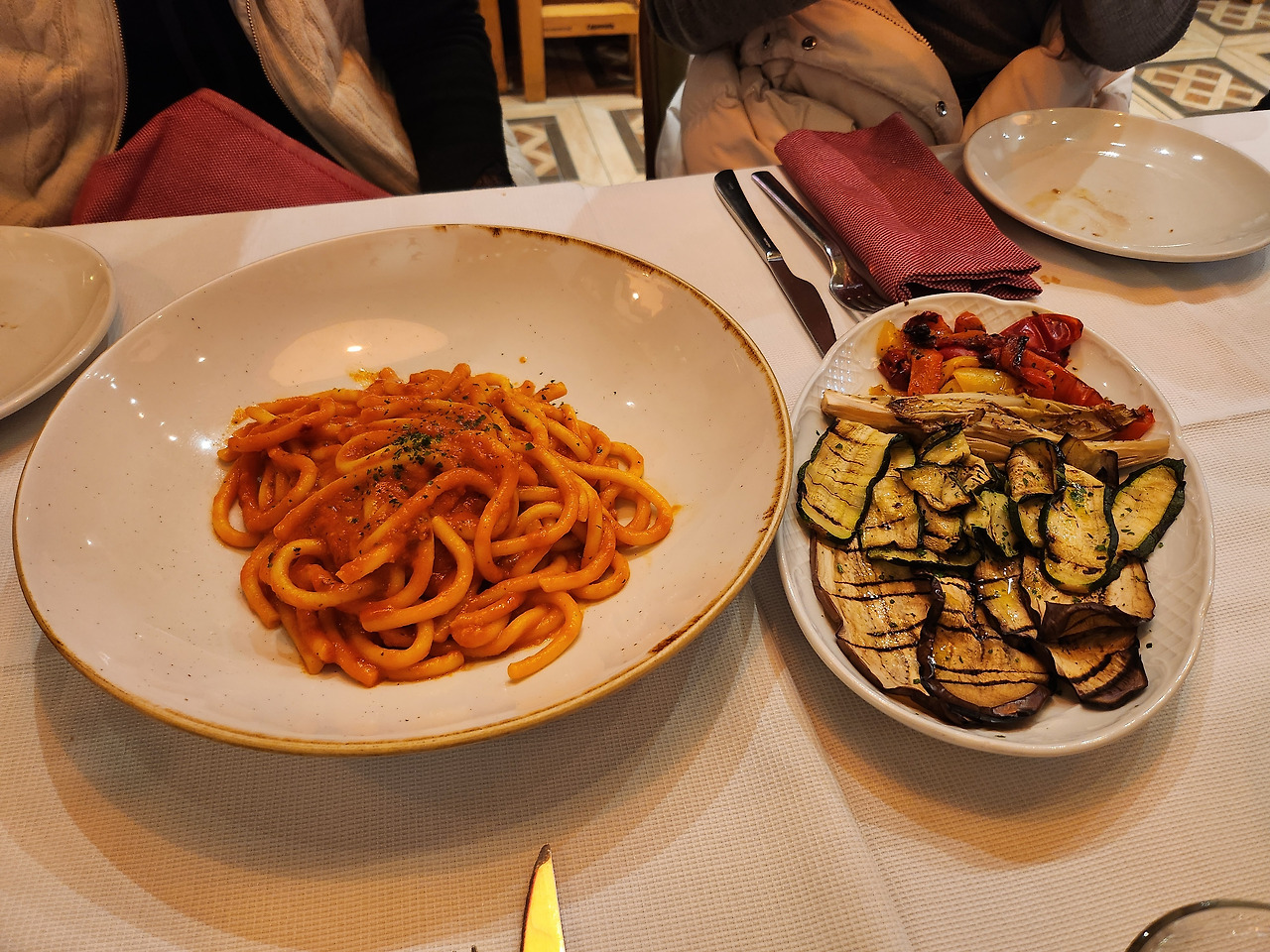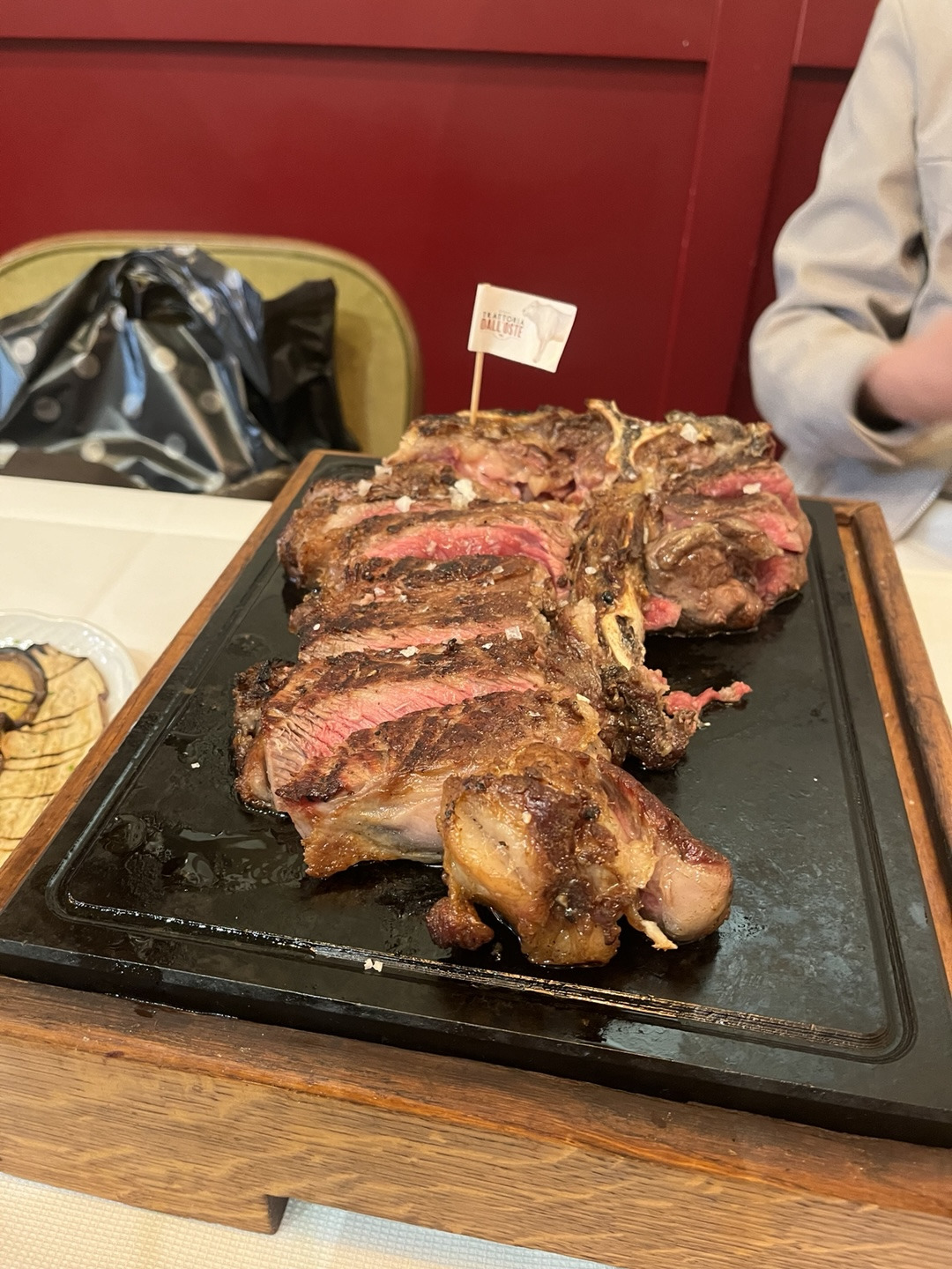 점심은 달오스떼에서 티본스테이크를 먹었다. 무슨 이유에서인지 피렌체가 티본스테이크로 유명해, 로마의 젤라또처럼 피렌체에도 3대 티본스테이크가 있었다. 우리는 그중 하나인 달오스떼를 선택했다. The Fork 어플로 예매하면 할인을 받아 과하지 않은 가격에 티본스테이크를 먹을 수 있는 것이 큰 장점이었다. 와인과 구운 채소, 토마토 칠리 파스타와 함께 티본스테이크 1.2kg를 주문했다. 파스타는 가격 거품이 조금 있는 듯했지만, 나머지는 그만한 값어치를 했다. 특히 티본스테이크가 간도 적당했고 딱 알맞게 구워져서 정말 부드러워 왜 유명한지 납득할 수 있었다. 그렇게 뿌듯하게 133유로를 결제하고 숙소로 돌아갔다.