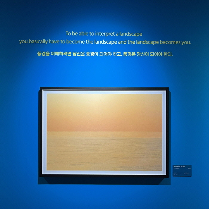 바로 “풍경을 이해하려면 당신은 풍경이 되어야 하고, 풍경은 당신이 되어야 한다”는 문구 아래 걸린 사막 빛의 바다 사진이다. 무엇보다 가장 바다 같은 짙푸른 벽 위에 걸린 모래사장 같은 바다 사진이라니.