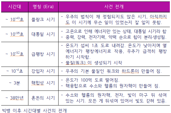 이제 우리는 빅뱅 직후 무슨 일이 있었는지 알아보기 위해 연대표(年代表)가 아닌 초간표(秒間表)를 살펴볼 것이다. 너무나도 짧은 시간에 엄청나게 중요한 사건들이 많이 전개되었기 때문이다. 폭발이 있고 나서 10-43초라는 극도로 짧은 시간이 흘렀다. 이 순간을 플랑크 시기라 부른다. 플랑크 시기는 아무것도 진행되지 않고, 아무것도 이루어지지 않은 시기였다. 심지어 ‘우주의 법칙’조차 채 정립되지 않은 ‘무(無)’의 시기라고도 볼 수 있다. 후술할 다른 시기(era)들이 각각 그 시기들의 특징에서 비롯되어 이름이 지어진 데 반해, 무의 시기이던 플랑크 시기는 한 물리학자의 이름을 따 지었을 뿐이다.
