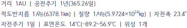 이제 우리 사는 곳 지구를 들여다볼 차례다. 지구는 2부 <지구>에서 별도로 살펴볼 예정이다. 따라서 여기서는 우리 보금자리로서의 지구가 아닌, 태양계 행성 중 하나로서의 지구를 개략적으로 살펴볼 것이다.
