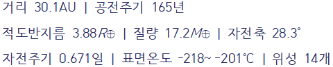 헬륨의 가스로 이루어져 있고 그 아래엔 물, 암모니아의 얼음과 고체 메탄으로 구성된 맨틀이 자리하고 있다.