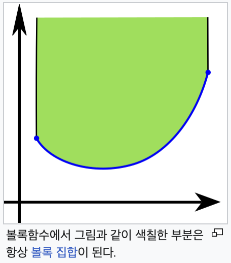임의의 두 점에 대해 그 함수값보다 크거나 같은 점들의 집합이 항상 볼록 집합인 경우 그 함수를 볼록함수라고 정의하기도 한다.