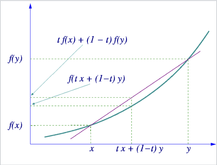 위키피디아에 따르면, 볼록함수는 임의의 두점을 이은 할선이 두점을 이은 곡선보다 위에 있는 함수이다. 위의 볼록집합의 정의를 기억하고 있다면, 볼록함수의 정의 또한 유추할 수 있을 것이다.