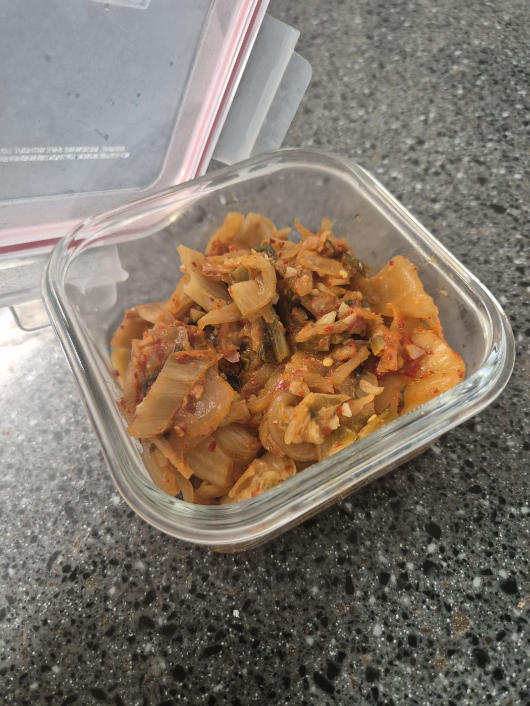 냉장고를 열어보니 엄마가 언제 줬는지도 모른 김치가 보였다. 죽기 직전의 김치를 꺼내 물에 다급하게 씻었다.