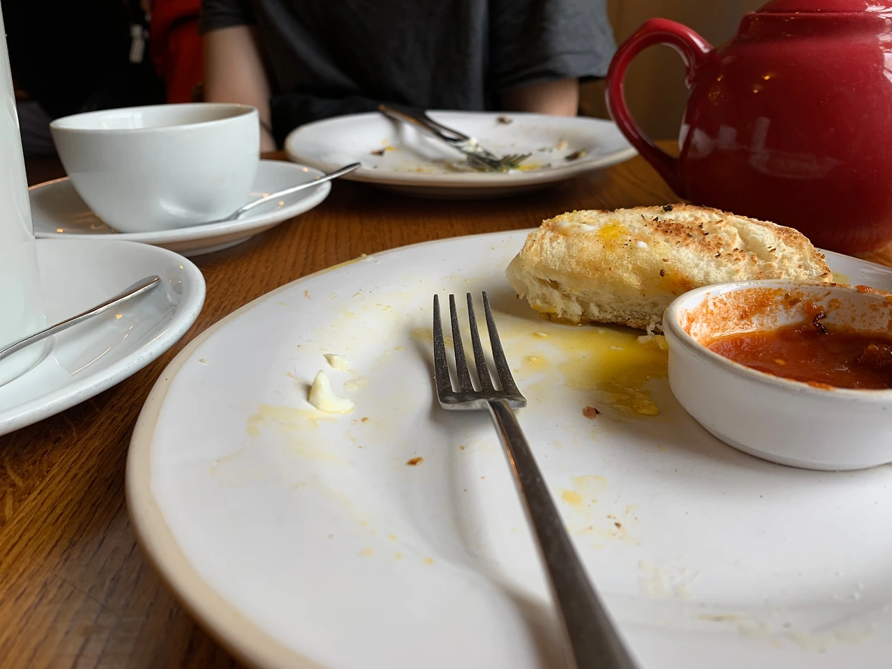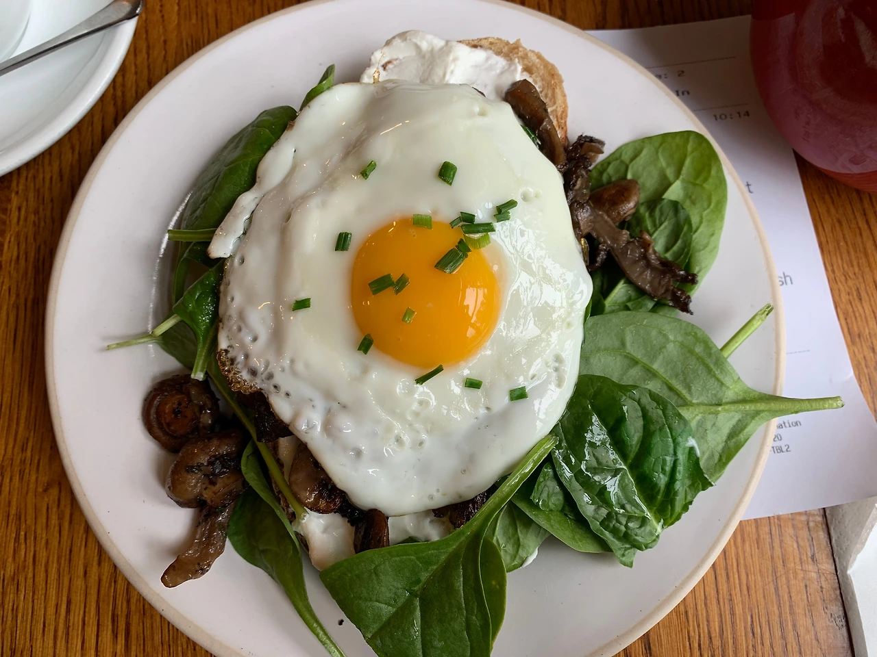 나는 고릿한 염소 치즈 위에 버섯과 달걀 프라이를 수북하게 얹은 바게트. 평소에 별로