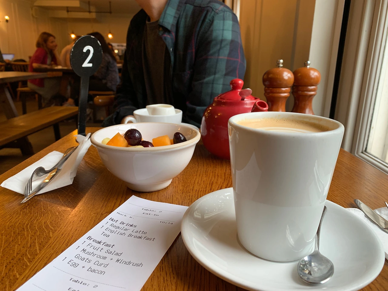 몹시도 커피가 고팠던 터라 커다란 잔에 라테 한 잔과 과일 한 사발. 걔는 밀크티. 소곤거리는