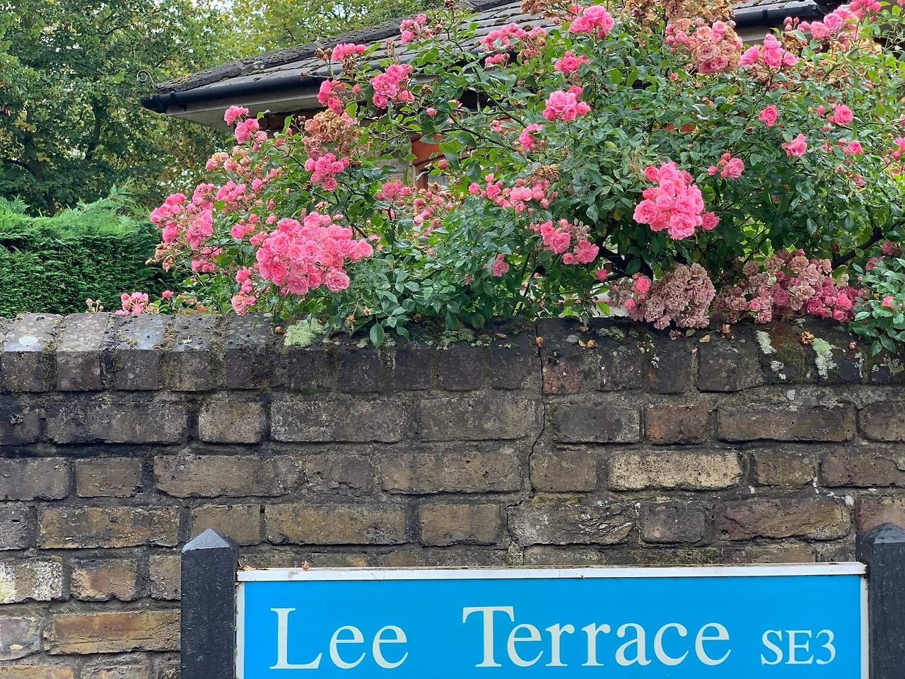 다시 집으로 돌아가는 길. 빨간 벽돌 우체국, 분홍 꽃이 담장을 타고 넘는 어떤 집 그리고 예배당도.