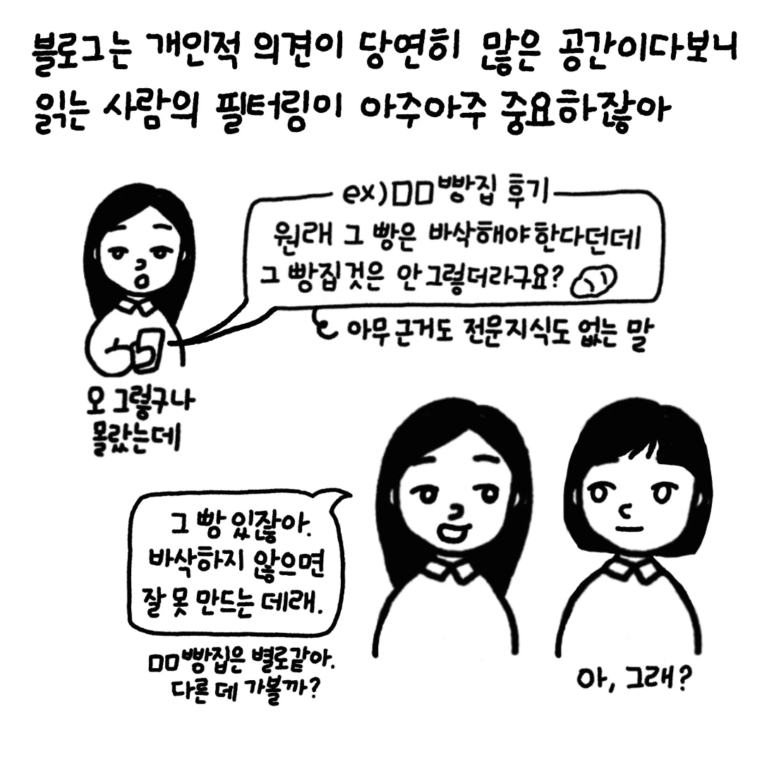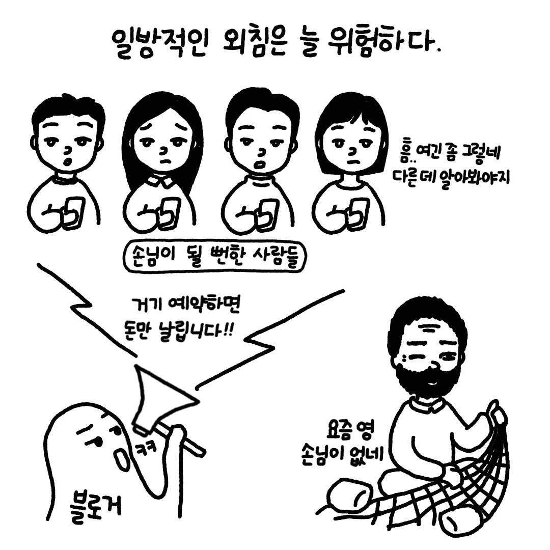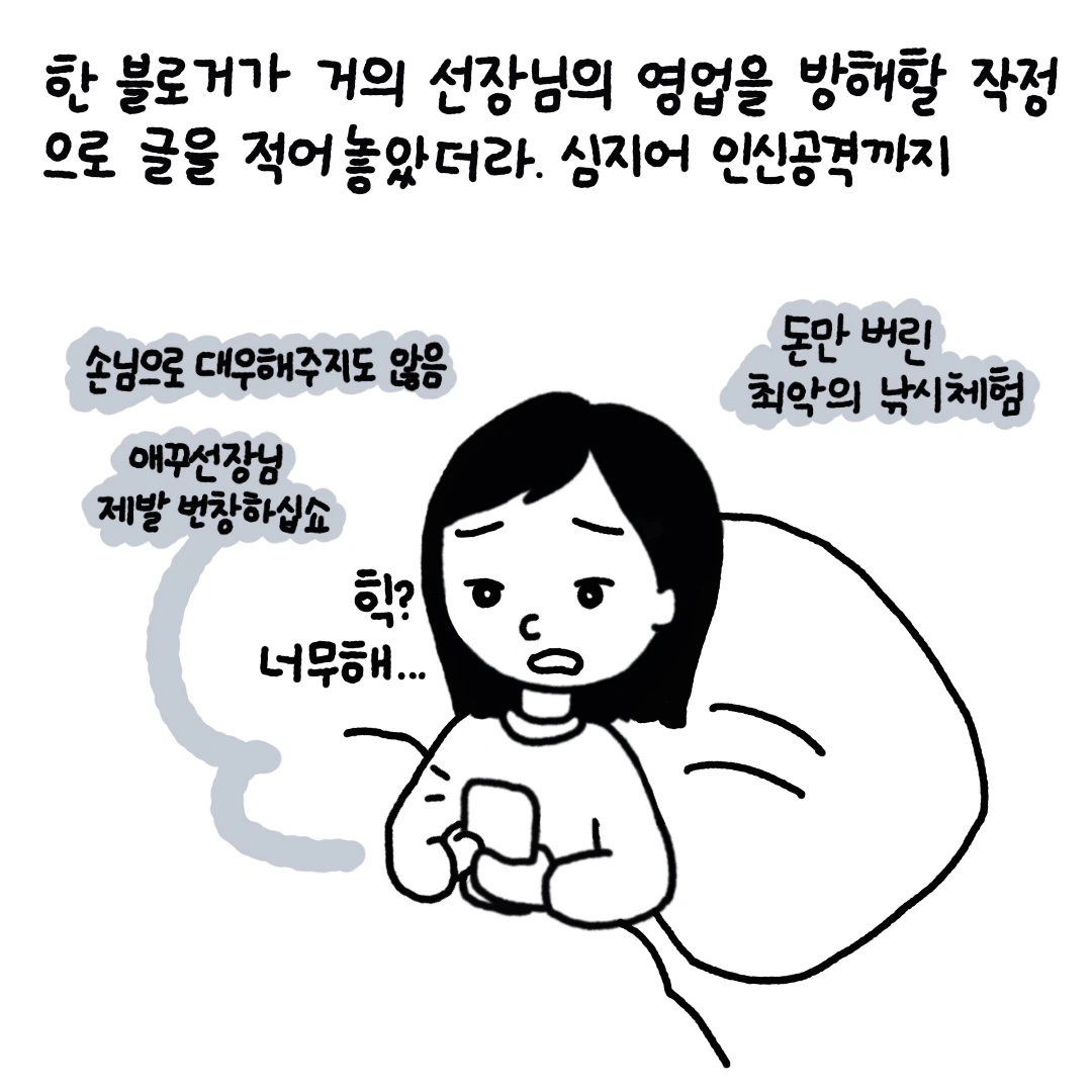 여러분은 블로그 후기나 평을 얼마나 믿으시나요? 특히 맛집 방문이나 체험 후기 등의 글은 개인적인 견해로 사업장을 비난&비하하거나, 작게는 본인 입맛에 안 맞는 것이 맛평가로 이어지는 경우가 있어 안타까운 마음입니다. 그 분들에겐 생업일테니까요.