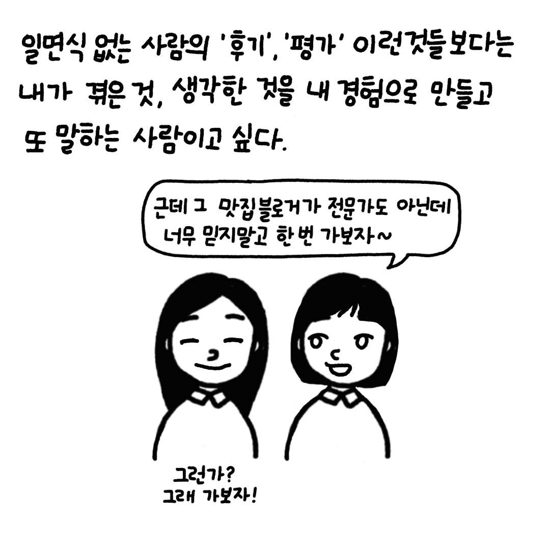 블로그나 SNS에 넘쳐나는 군중심리로 만들어진 맛집, 사진맛집 등을 보며 남의 경험을 내 것으로 만드는 것보다 저는 제 경험을 택하겠습니다.