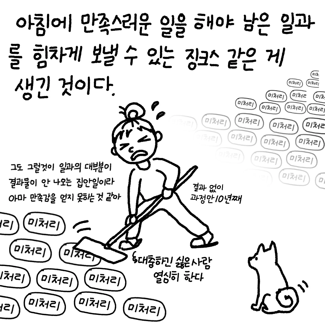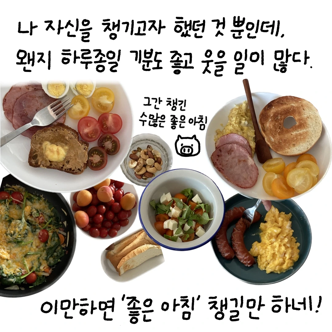 오늘은 제가 스스로 좋은 하루를 만들기 위해 일상적으로 하는 것들을 담아봤어요. 저는 주부이기때문에 사실 퇴근시간이라는 게 따로 없습니다. 다만 가족구성원이 외부활동(출근 및 등교)을 하러 나가면 혼자만의 시간이 주어지죠. 주로 이 시간을 활용해 적극적으로 일상의 만족감을 찾아가고 있어요. (대부분의 주부들이 자유로이 쓸 수 있는 시간은 하루 중 오전 9시~ 오후 14시 정도까지)