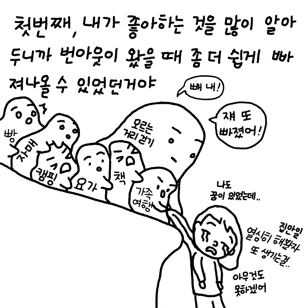 저도 회사원이던 절무니 시절엔 하루하루 주어진 일을 해내는 데에 급급해서 제 마음을 돌보거나 챙기는 것은 거의 하지 못했는데요, 주부가 되며 동시에 나이를 먹어가니 이제서야 저 자신을 돌아보게 되네요. 아 물론 요즘 절무니들은 참 일찍부터 자기 자신도 잘 챙기더라구요! 현명들 해라 라떼는 그저 사회구성원으로서 열심히 일하면 칭찬받고 인정받고 그게 좋은 줄로만 알고 살았다네…아무튼여