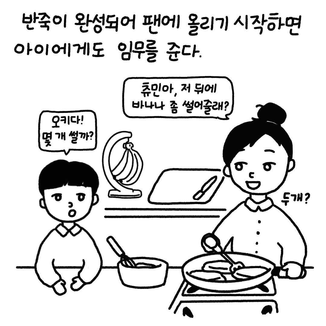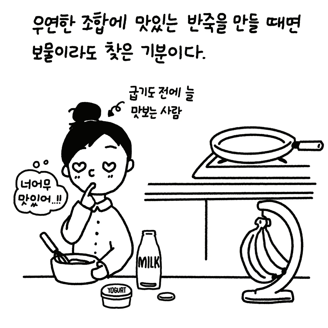팬이 달궈지면 약불로 줄인 뒤, 버터 한조각을 넣고 반죽을 원하는 크기로 떠넣는다. 반죽 표면에 보글보글 방울이 올라오며 터지면 뒤집고 익히면 끝!