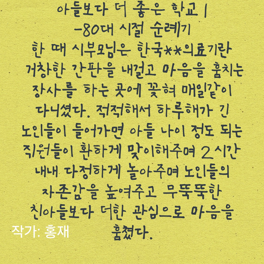 효도와 불효의 간격은 어느 만큼이 적당할까? 분명히 이론으로는 삭막한 고령화시대에 외로운 노인들에게 접근한 나쁜 상술인 줄 알지만 아이처럼 기뻐하시는 마음을 거스르기가 쉽지 않다. 80대 시절, 두 분은 당당하게 어깨를 펴고 아들보다 더 좋은 학교에 다니셨다. 사백만 원이 넘는 만만치 않는 돈을 주고 구매한 효력을 누렸다.