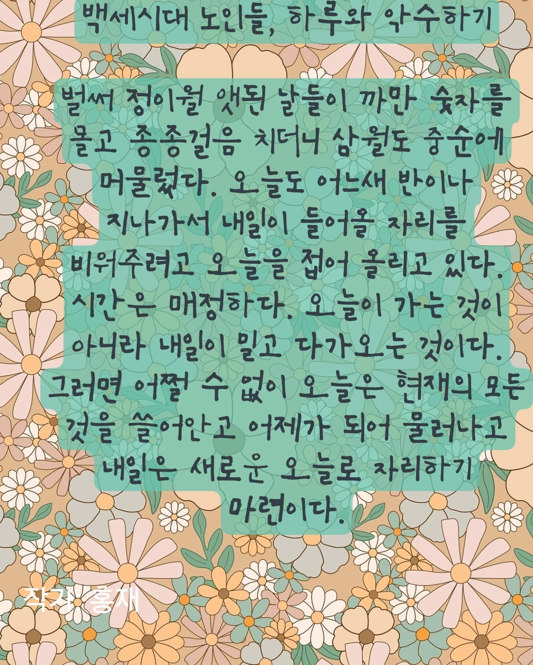하루가 모두에게 공평한 시간을 내어주면 젊은이들은 바쁘다고 종종거리고 노인들은 느즈러지며 시간을 소비할 걱정을 한다. 내일은 팔짱을 끼고 기웃거리며 기다린다.