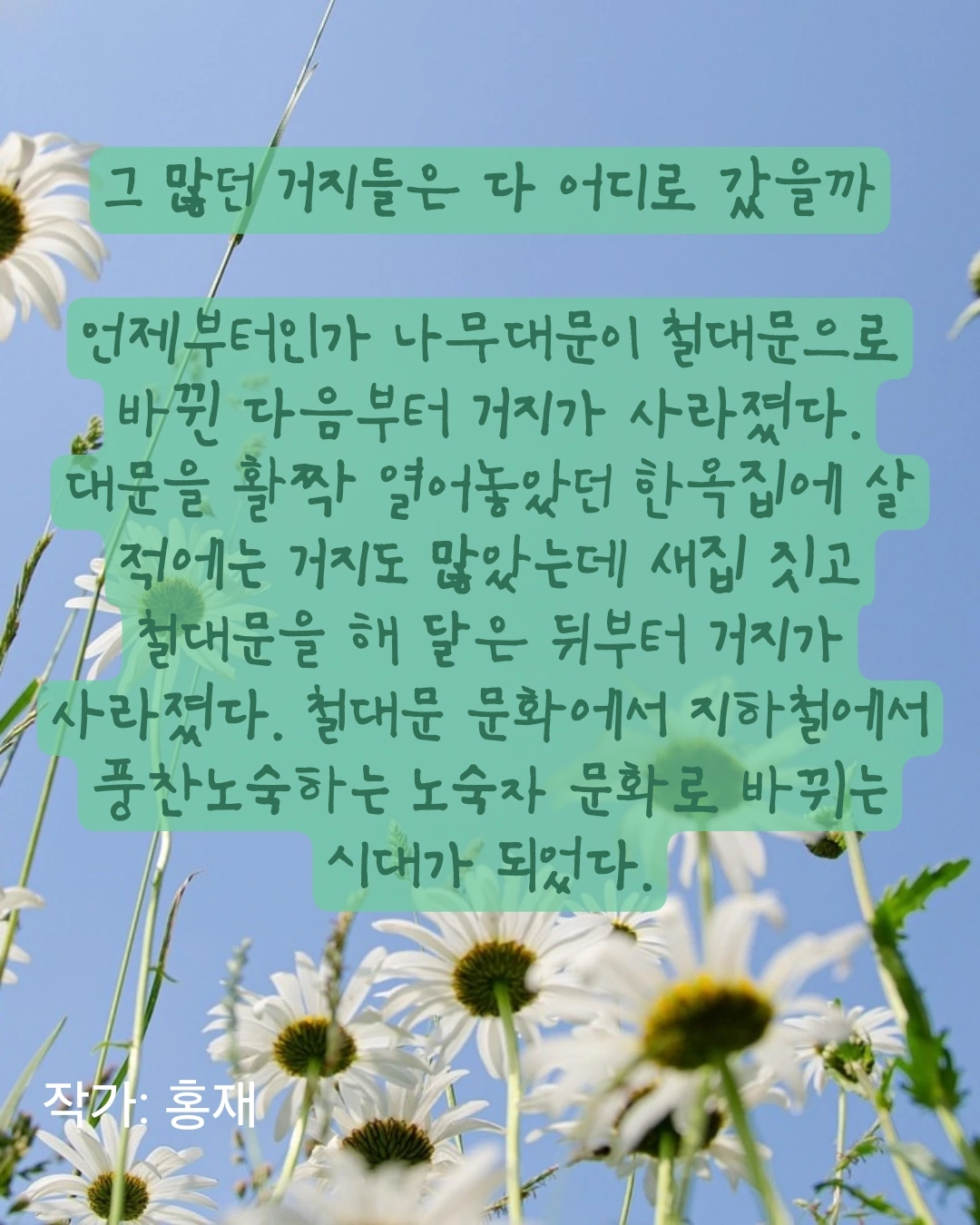 사십여 년 전만 하더라도 거지라 불리는 반 늙은 남자들을 심심치 않게 보던 시절이 있었다. 거지가 밥 좀 주쇼 하고 대문에 대고 소리치면 시할머니는 사랑채 바깥 툇마루에 앉으라 하고 ""새 아이야, 밥 차려 오니라."" 나를 부르셨다.