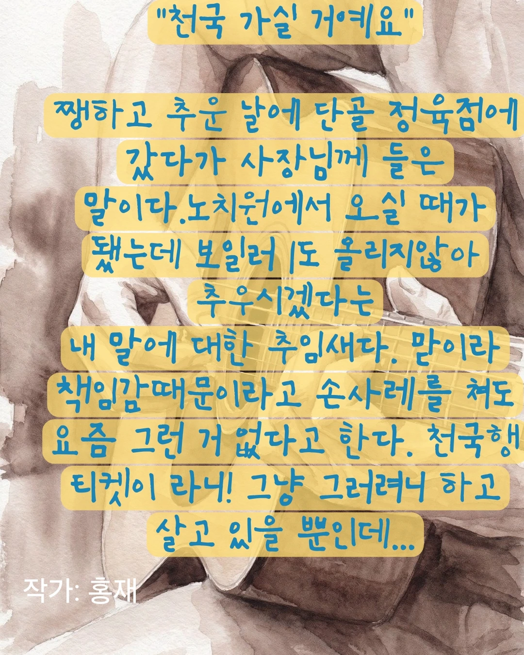 요즘은 만나는 지인들마다 어머님 나이를 물어보다가 얼마라고 하면 고개를 끄덕이며 의미심장한 미소를 짓는다. 그러면서 "에구구. 고생하네요"라든가 "에구, 모셔본 사람만 그 마음 알지 "라던가 "복 받으실 거예요"라는 말을 한다.
