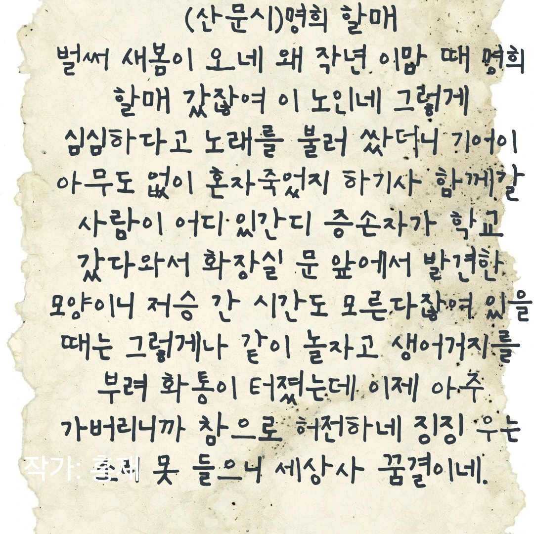 비리비리한 몸으로 3층계단을 비척걸음으로 올라오신 명희 할매의 첫말은 늘 똑같았다. 이내 시어머니는 어서 오라고 손을 잡아끌고 마주 앉은 두 분의 말씀은 시시콜콜한 가정사부터 정치 이야기까지 하고서야 끝을 맺었다.