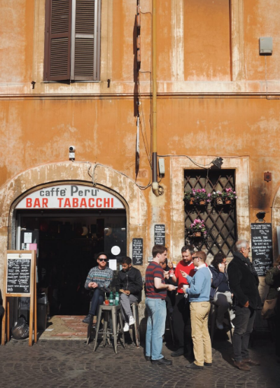 저녁이 되면 bar는 또 다른 얼굴을 보인다. 아침에는 에스프레소의 공간이던 곳이 저녁에는 aperitivo, 곧 저녁 식사 전에 가볍게 한잔 하며 입맛을 여는 시간의 공간으로 바뀐다. 그러니 이것도 단순히 술을 마시는 행위라고만 보면 좁다. 이탈리아의 bar는 아침에는 각성의 공간이고, 낮에는 짧은 숨 고르기의 공간이며, 저녁에는 식사 전 사람과 시간이 느슨해지는 공간이 된다. 하나의 장소가 하루 안에서 여러 역할을 맡는 셈이다.