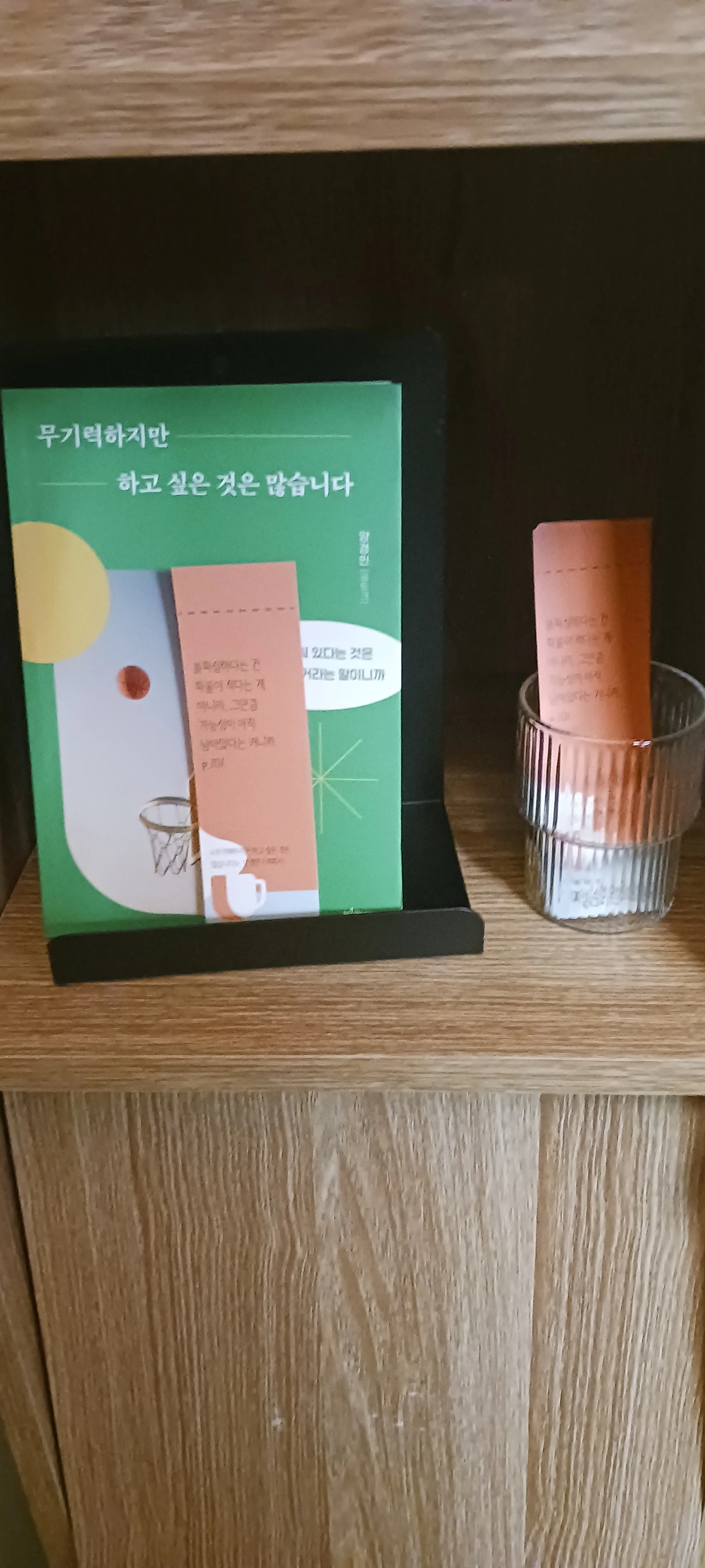 그 가게에는 책처방코너가 있어서 바깥의 문장을 본 후, 뚜껑을 들어 열면 책과 그 책에서 뽑은 문장으로 된 책갈피를 하나씩 가져갈 수 있게 해 놓았다.