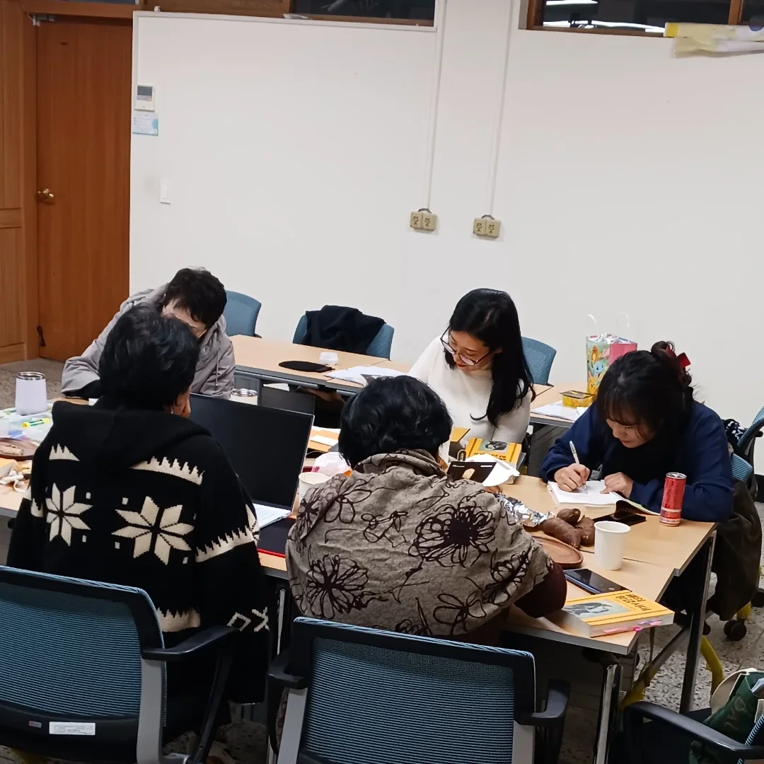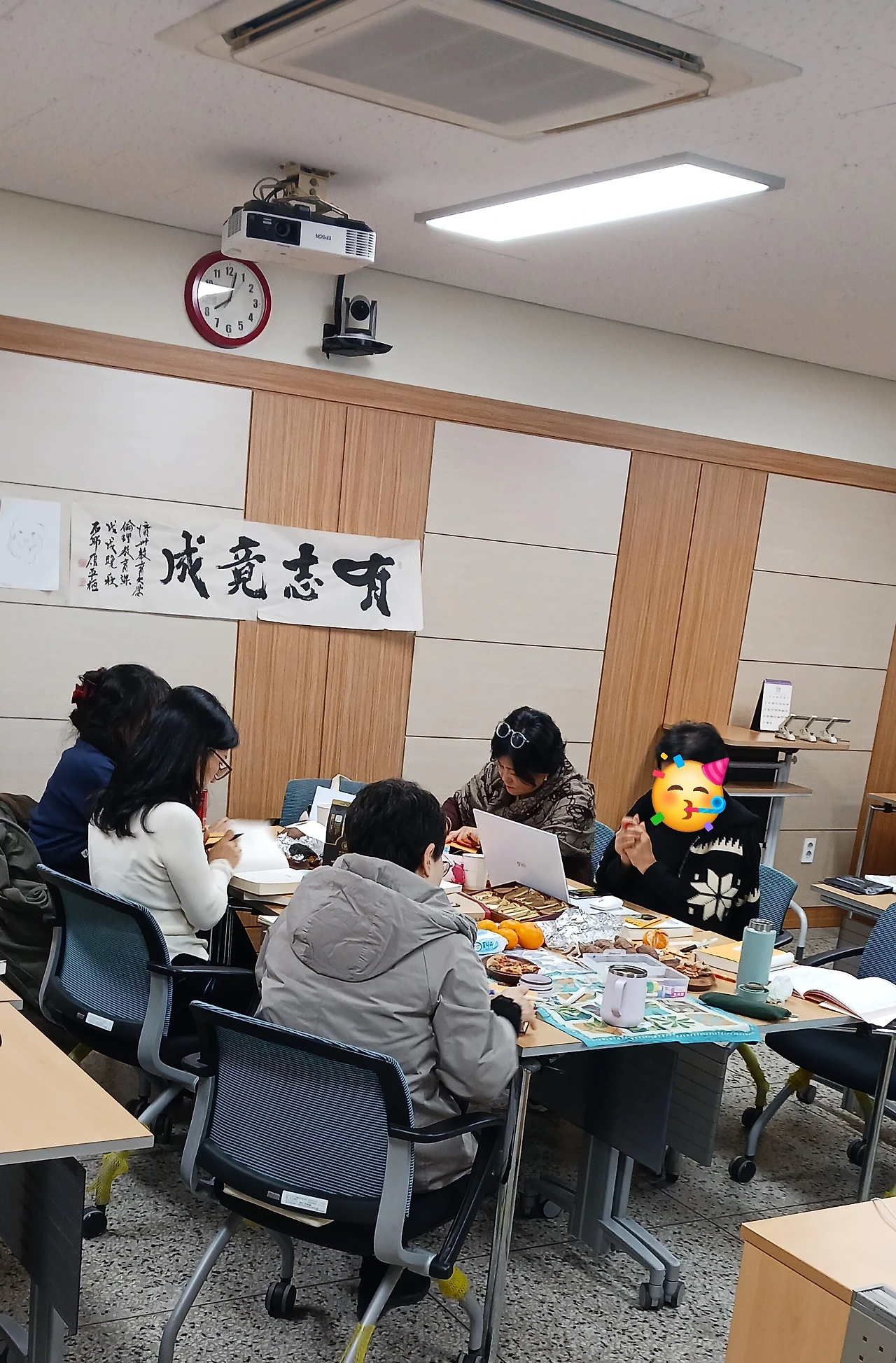 수업 후 간단한 다과-피자, 치킨, 구운 고구마, 김밥, 귤, 펑리수(과자)-와 공부한 책에 글을 써주는 롤링북 책거리 행사까지 했다.