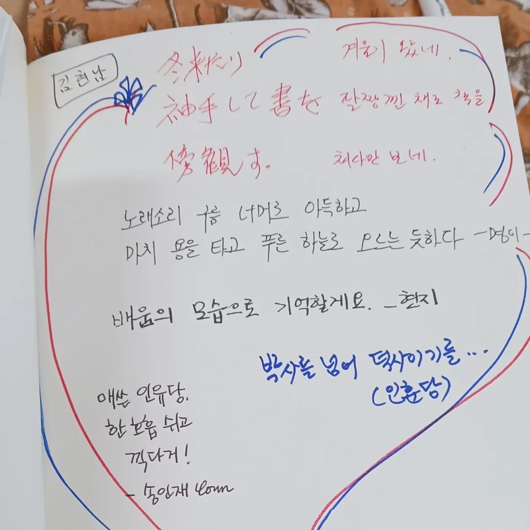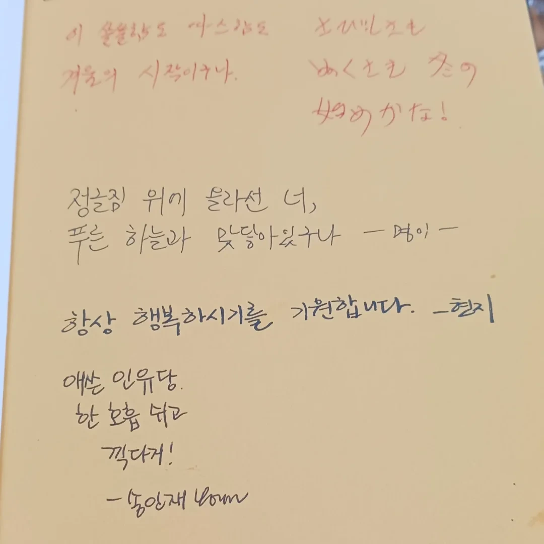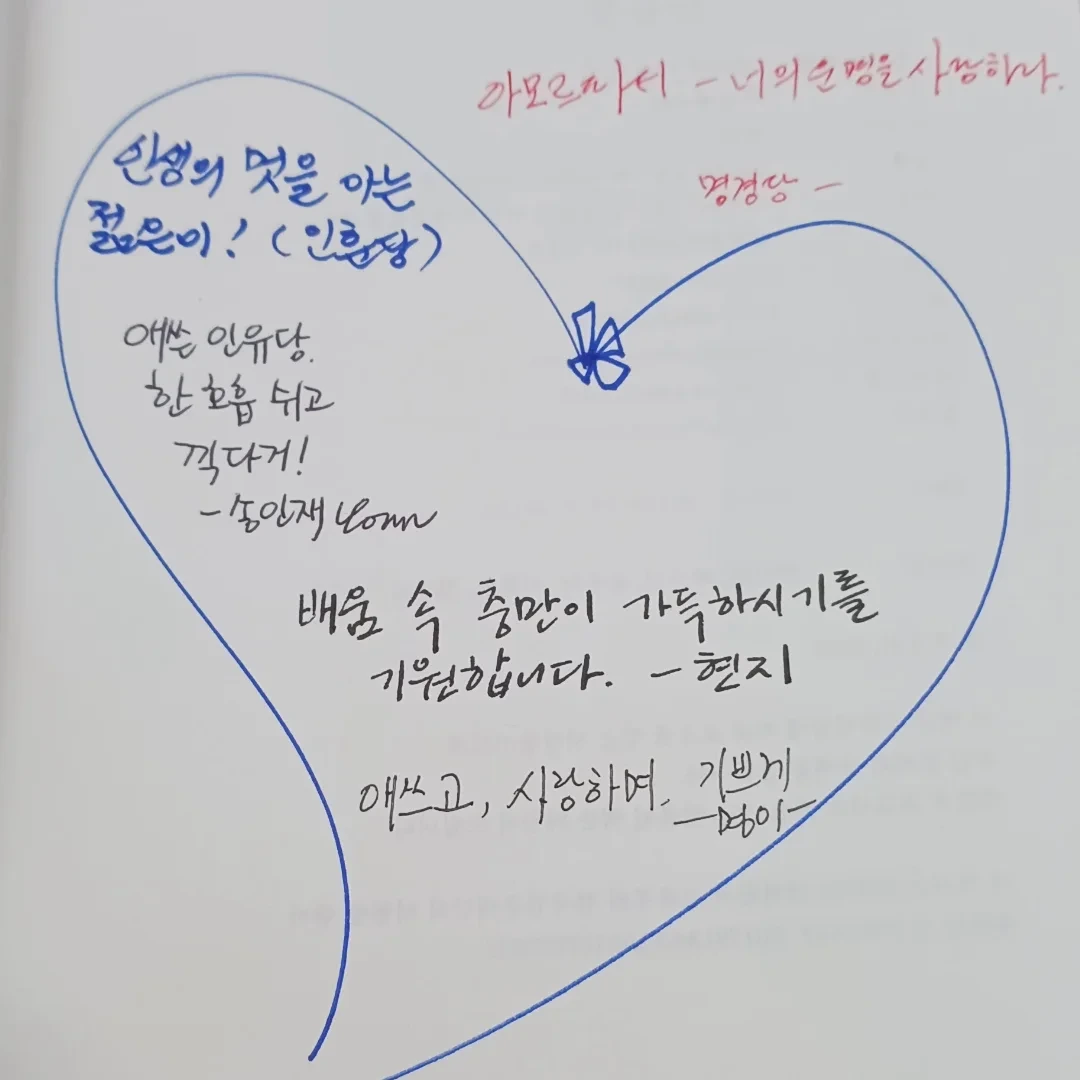 MBTI라는 건 내가 바라보는 나이니, 나를 잘 알려면 주위의 사람들에게 나에 대해 물어봐야 한다는 김영하작가의 말이 생각난다. 사람들이 내 책에 써준 말이 다른 사람들이 바라보는 나.