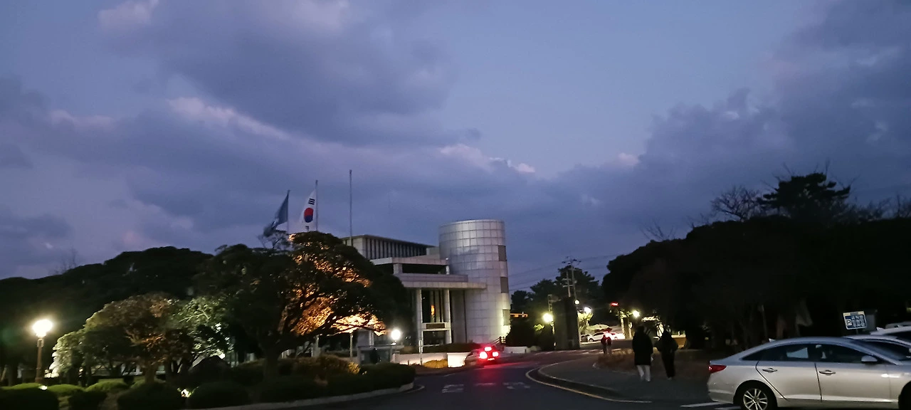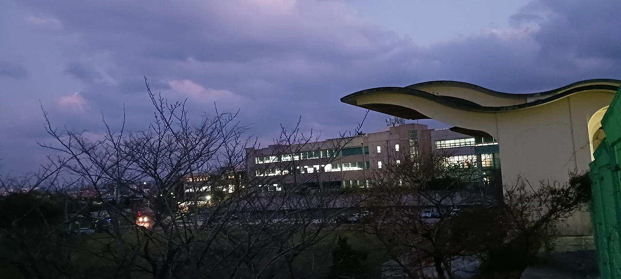 학교건물이다. 구건물. 사라교육관이라고 불린다. 저 불 켜진 점점 중 하나, 306호 강의실이 오늘의 강의실. 3층까지 계단으로 올랐다. 이때까지, 오늘 하교를 또 걸어서 할지 차를 타고 가게 될지 모르므로 한걸음이라도 더 걸으려고 애썼다.