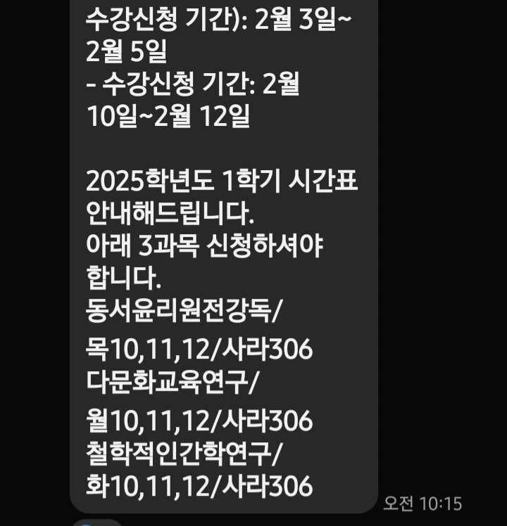 오늘 오전, 대학원 학과 조교에게 수강신청 안내 문자를 받았다.