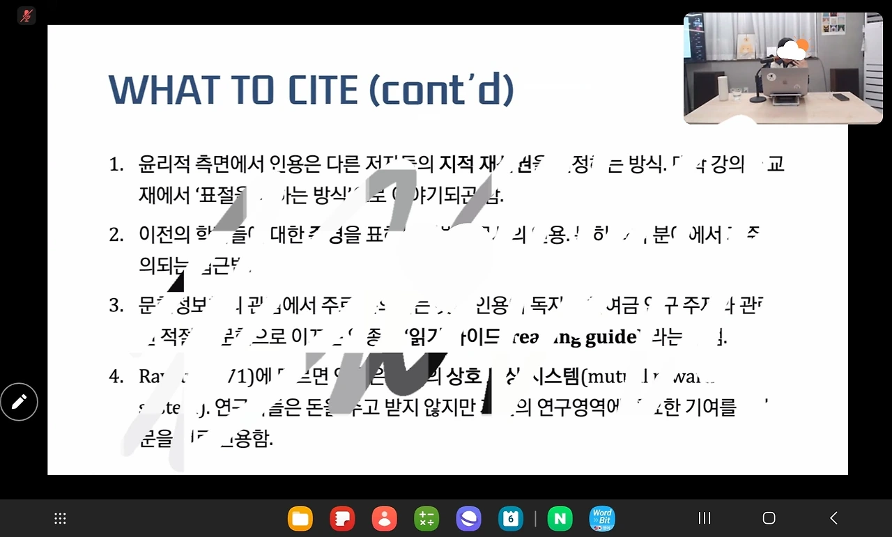 오늘 듣는 인풋은 [영어로 논문 쓰기]란 타이틀의 수업이었다. 전부 5번이 예정되어 있고 오늘은 4강 차례였다. 오늘은 2주간의 방학(쉬는 기간에 하라고 대단한 과제를 주셨으나, 안 했다. 아니 못했다. 실은 나는 영어로 된 관련논문을 읽는데 아직 익숙하지 않다. 한글로 된 논문보기도 벅차다고 변명을 해본다.)