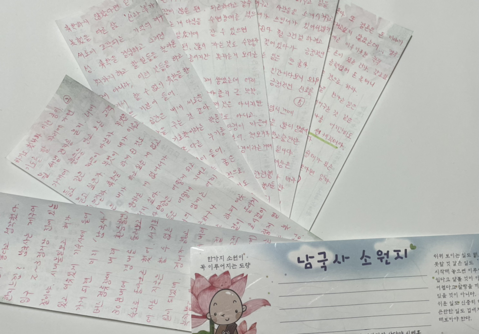 종이 질이 좋다고 생각했다. 한지 느낌? 남국사는 제주대 입구 2~3 정거장 전에 있는 절이야. 시내 볼일 보고 해가 있고 여유 있게 기숙사에 들어가게 되면 미리 '남국사'버스 정류장에 내려 환승할인 30분 내에 경내를 둘러보고 숙소로 돌아오곤 했어. 서귀포에 사는 지금은 할 수 없는 일이 되었네. 경내가 넓고 녹차밭도 있고 버스에서 내려 바로이고.. 뭐 좋아한 절 (불상 등 불교교육의 종교적 기능은 그다지 마음 끌리지 않았어) 그걸 마당에 소원지를 배다는 코너가 있어. 올 초파일 즈음 가니까 생겼는데 아직도 가면 있는 게 이제 상시 운영하기로 했나 봐.