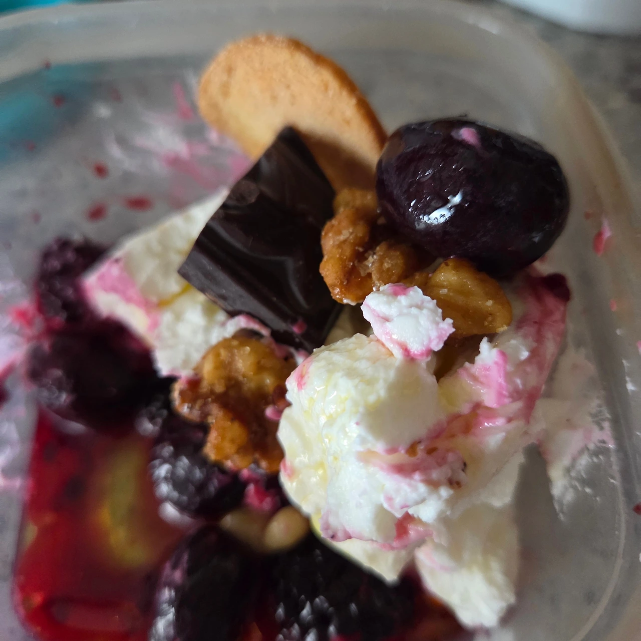 아침은 그릭요구르트에 세 가지 베리믹스 냉동과일, 여기에 호두정과와 잣 토핑.