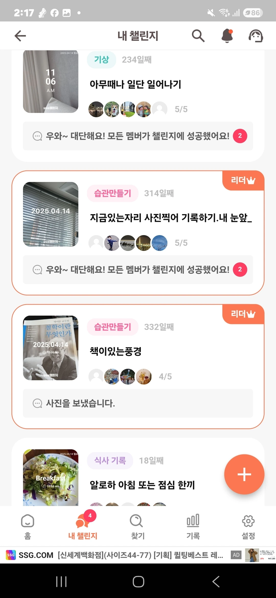 그런데, 알림이 뜨면 들어가서 인증하고, 오늘 챌린지 구성원들이 모두 사진을 올렸는지 수시로 그 앱에 접속해서 확인을 했다. 처음엔 출석체크를 위해 봐야 하는 광고 30초가 내 시간을 빼앗는 원천이어서 내가 이거 십원단위의 돈을 받겠다고 이래야 하나 싶었다. 30초 광고시간만이 내 피해고 광고 플레이 시간에 딴 거 하다가 돌아와 체크하면 되니까 별거 아니라고 생각했다.