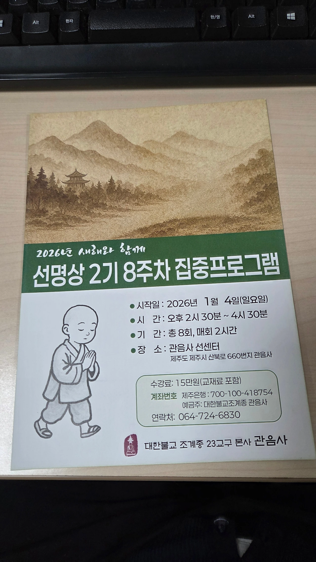 왜 했느냐라고 한다면 평소 명상이 실리콘 밸리를 휩쓴 멘털 트레이닝이라고 하기에 관심을 가져왔었다. 얼마 전 기회가 닿아 원광디지털 대학교 요가 명상학과의 수련회도 다녀오는 등 인연을 찾아 헤맸었다. 그러나, 좋다는 말은 넘치는 데, 어디서부터 어떻게 시작해야 할지 알기 어려웠다. 그러다가 제주 관음사에서 선명상 8주 코스를 시작한다는 것을 알게 되어 신청했다. 일요일 오후... 2시간.... 부담 없이 '찍먹' 가능해 보였다.